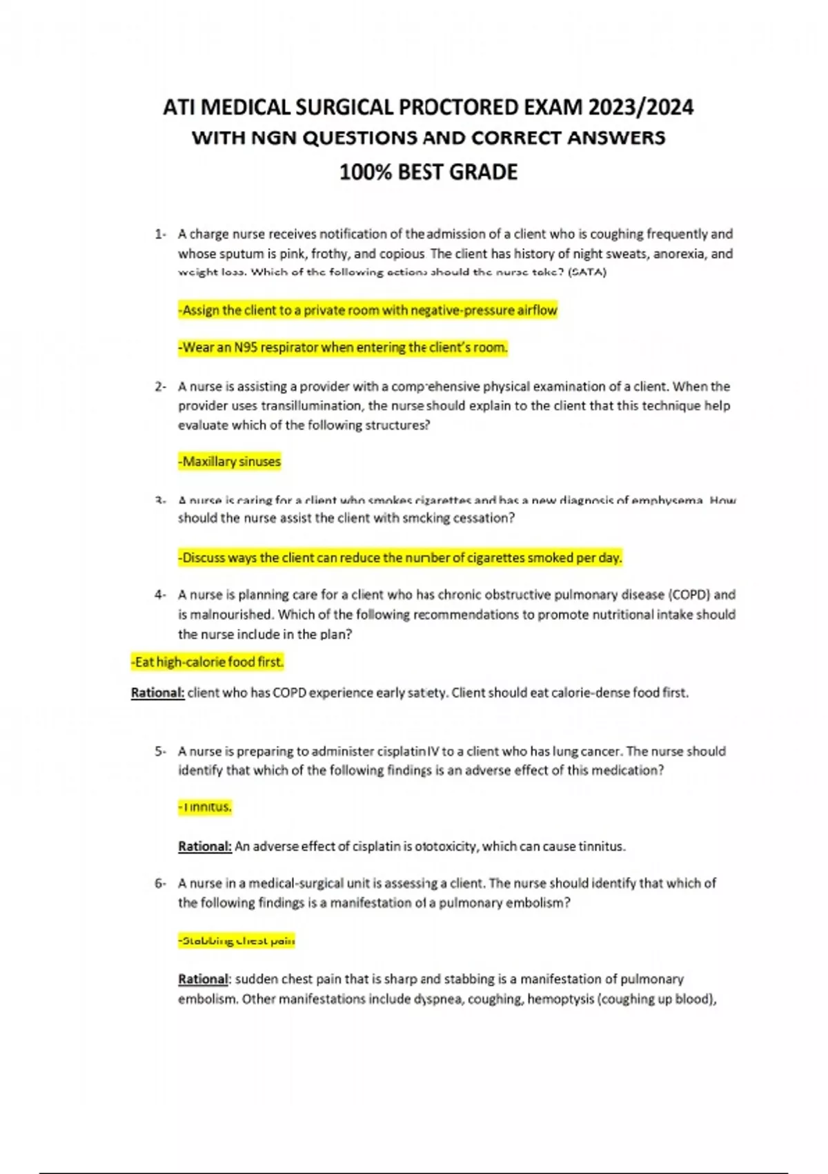 ATI MEDICAL SURGICAL PROCTORED EXAM 2023/2024 WITH NGN Stuvia Is Available For Download After Purchase. In Case You Encounter Any Difficulties With The Download, Please Feel Free To Reach Out To Me. I Will Promptly Send It To You Through Google Doc or Email. Thank You. ATI MEDICAL SURGICAL PROCTORED EXAM WITH NGN QUESTIONS AND ANSWERS serves as your pivotal study companion, crafted to navigate the complexities of the nursing practice exam. This resource zeroes in on the ATI Med Surg Proctored Exam, equipping you with a rich collection of NGN questions and answers. It's your gateway to mastering medical surgical exam content, tailored for the proctored exam 2024. The ATI Med Surg study material within is curated to bolster your nursing exam preparation, offering strategic insights and ATI NGN practice questions. These elements are designed to refine your understanding and approach, making this guide an indispensable tool for your Med Surg exam tips arsenal. As you engage with this proctored nursing test prep, you'll find yourself better prepared, more confident, and ready to excel in the ATI Med Surg Proctored Exam. Download ATI Medical Surgical latest questions or ATI Medical Surgical test bank today!