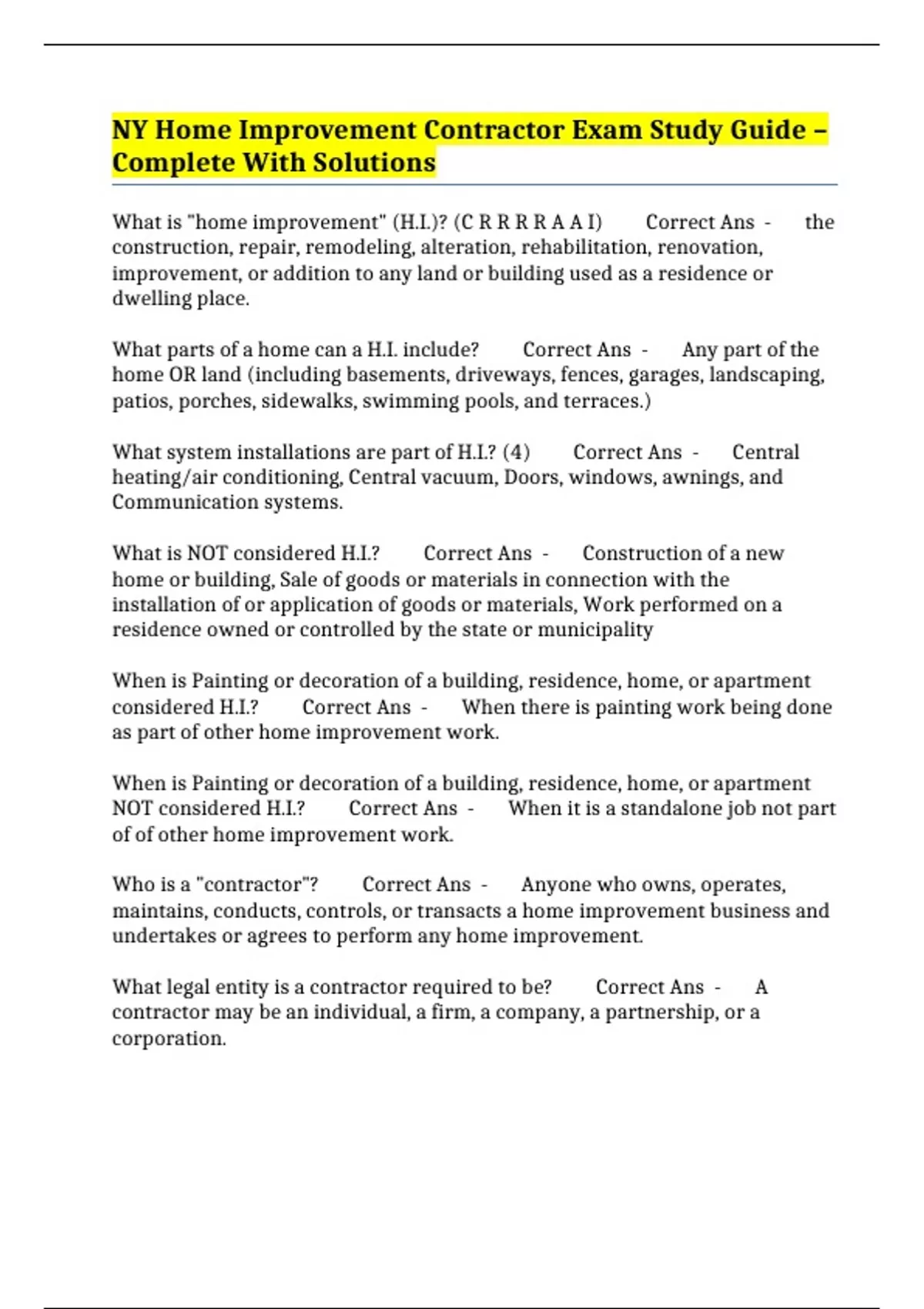 NY Home Improvement Contractor Exam Study Guide – Complete With Solutions