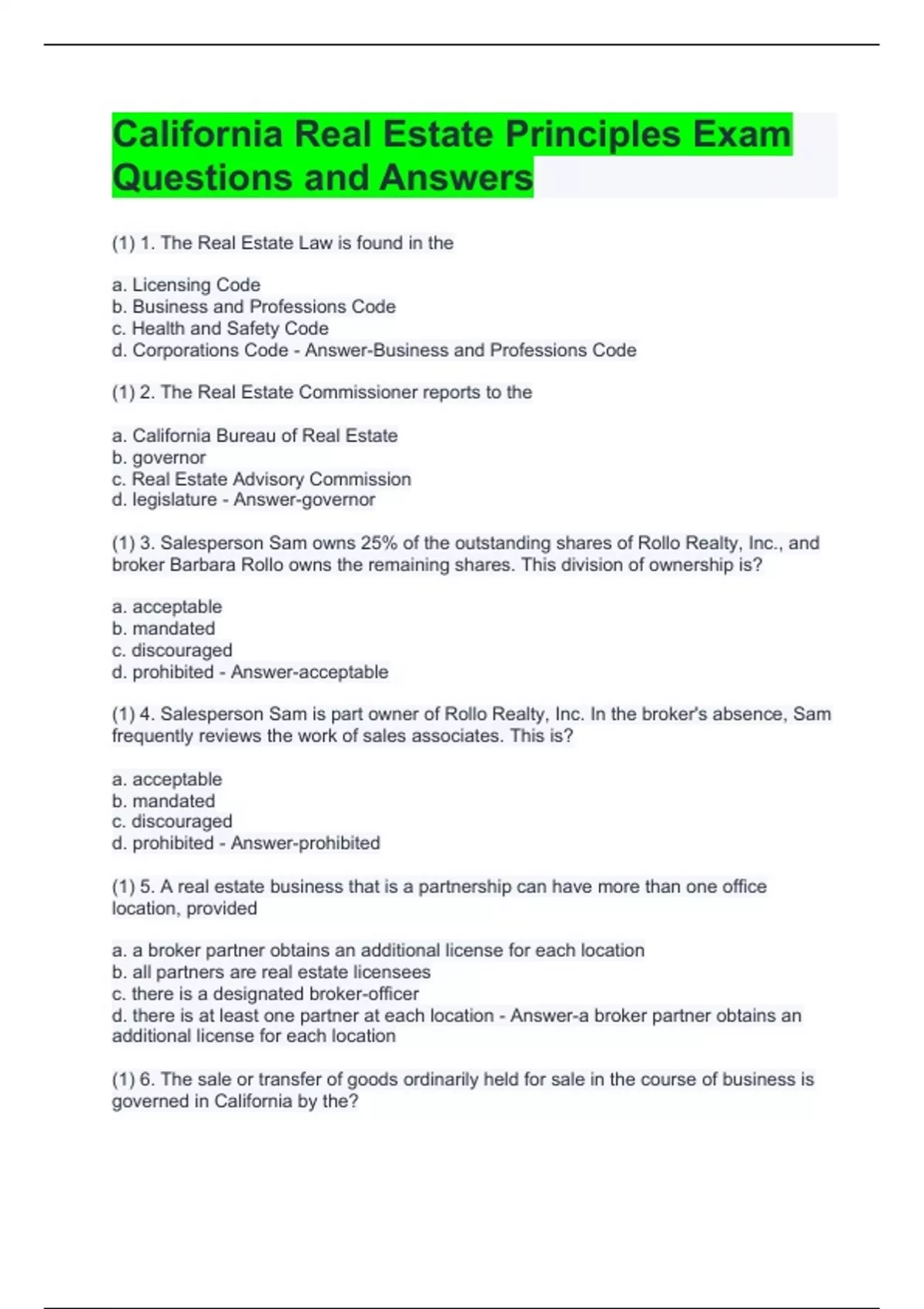 California Real Estate Principles Exam Questions and Answers (3) 1. A fee simple estate and life estate are a. freehold estates b. fee simple estates c. leasehold estates d. estates of tenancy - Answer-freehold estates (3) 2. The highest form of ownership is the a. life estate b. real estate syndicate c. fee simple absolute d. estate at will - Answer-fee simple absolute (3) 3. Victor and Karen are not married but together own community property because they are a. brother and sister b. joint tenants c. registered domestic partners d. holders of a life estate - Answer-registered domestic partners (3) 4. A fee simple estate that may be lost when some act is performed is a a. life estate b. fees simple absolute c. remainder d. fee simple on condition subsequent - Answer-fee simple on condition subsequent (3) 5. A fee simple estate that has no conditions is a a. life estate b. remainder c. fee simple on condition subsequent d. fee simple absolute - Answer-fee simple absolute (3) 6. If Greenacre is deeded by Lou to Mary for Mary's life, Mary has a. a life estate b. an estate in remainder c. an estate in reversion d. no interest - Answer-a life estate (3) 7. If Greenacre is deeded by Lou to Mary for Mary's life, Lou has