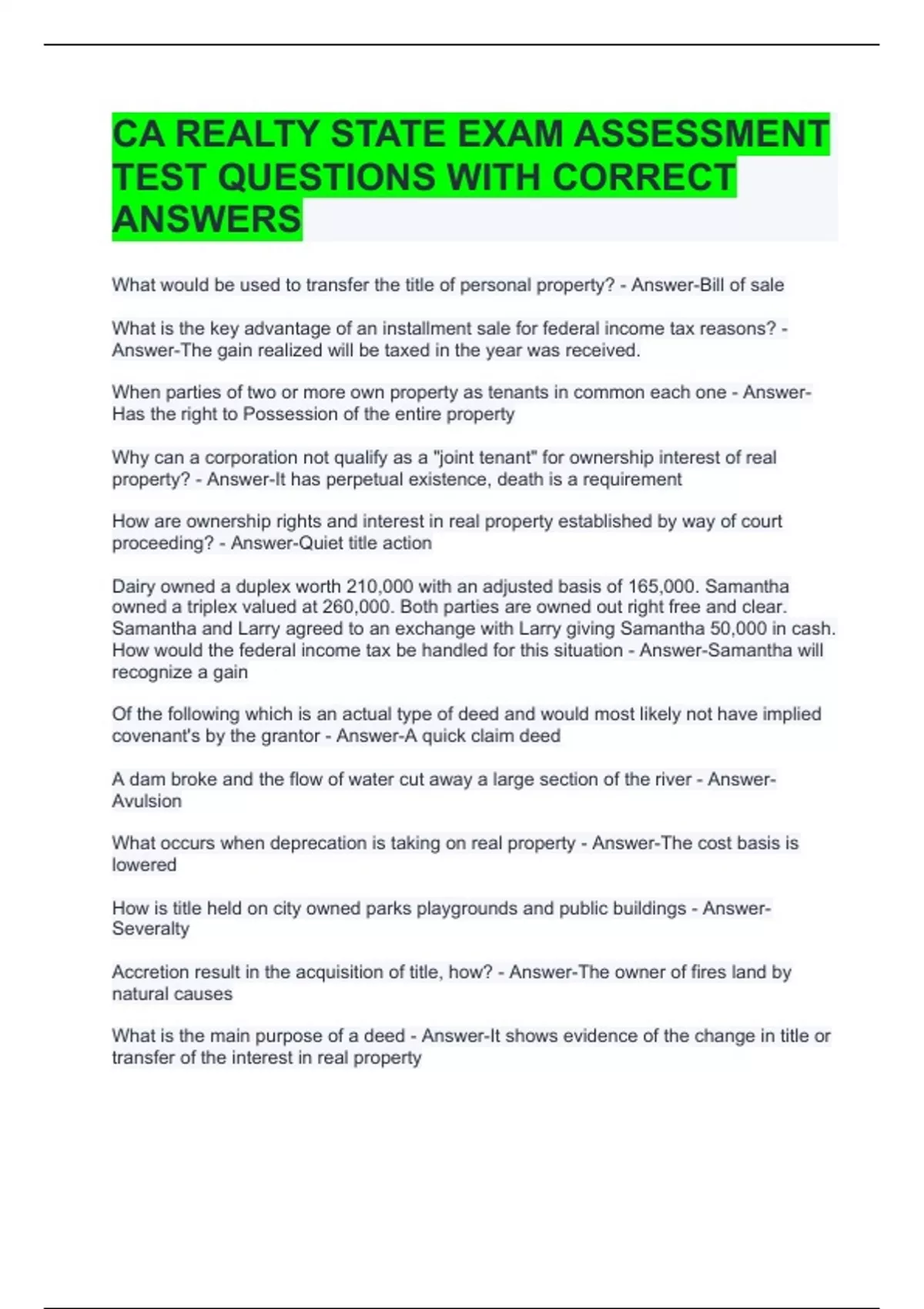 CA REALTY STATE EXAM ASSESSMENT TEST QUESTIONS WITH CORRECT ANSWERS With whom does someone report a file to under the subdivision map at - Answer-Local city, town or county where the land is located If an owner of a property allows a telecommunication company to place a cell tower on their land, which type of encumbrance you with this create? - Answer-An easement The following are ways to determine if something is either personal property or real property - Answer-Five test of the fixture intention of attachment, method of attachment, adaptability of the items, agreement of the parties, and relationship of the parties The commissioners final public report would include all the following for residential development - Answer-Assurances that all these divisions of the subdivided land acts are followed, assurances that the developer has the means to handle warranty with where the purchaser, assurances that financial arrangements are made to provide community improvement