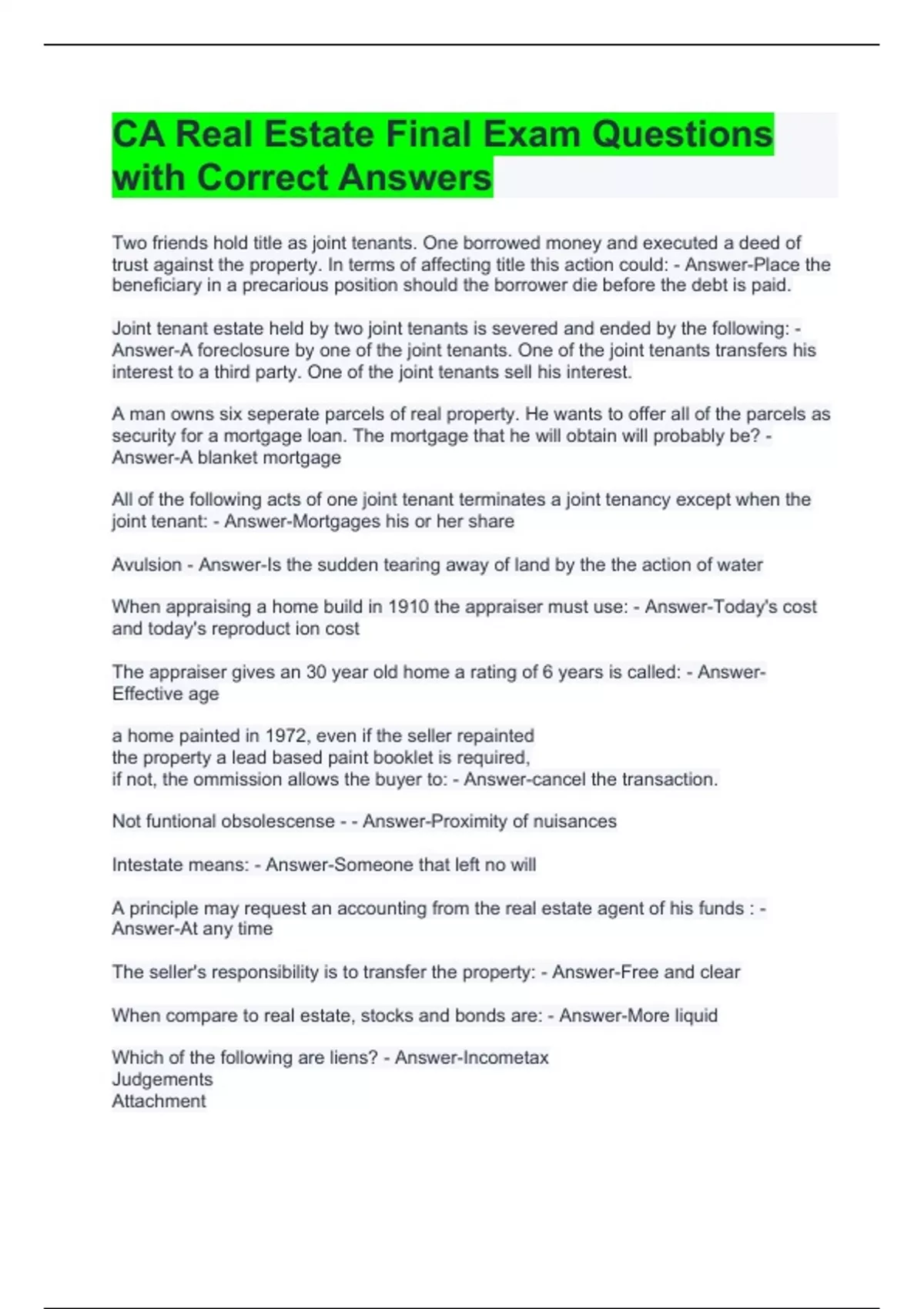 CA Real Estate Final Exam Questions with Correct Answers