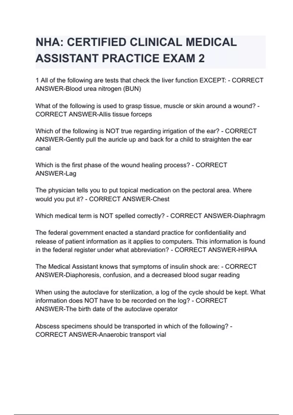 NHA: CERTIFIED CLINICAL MEDICAL ASSISTANT PRACTICE EXAM 2 questions and answers latest 2024