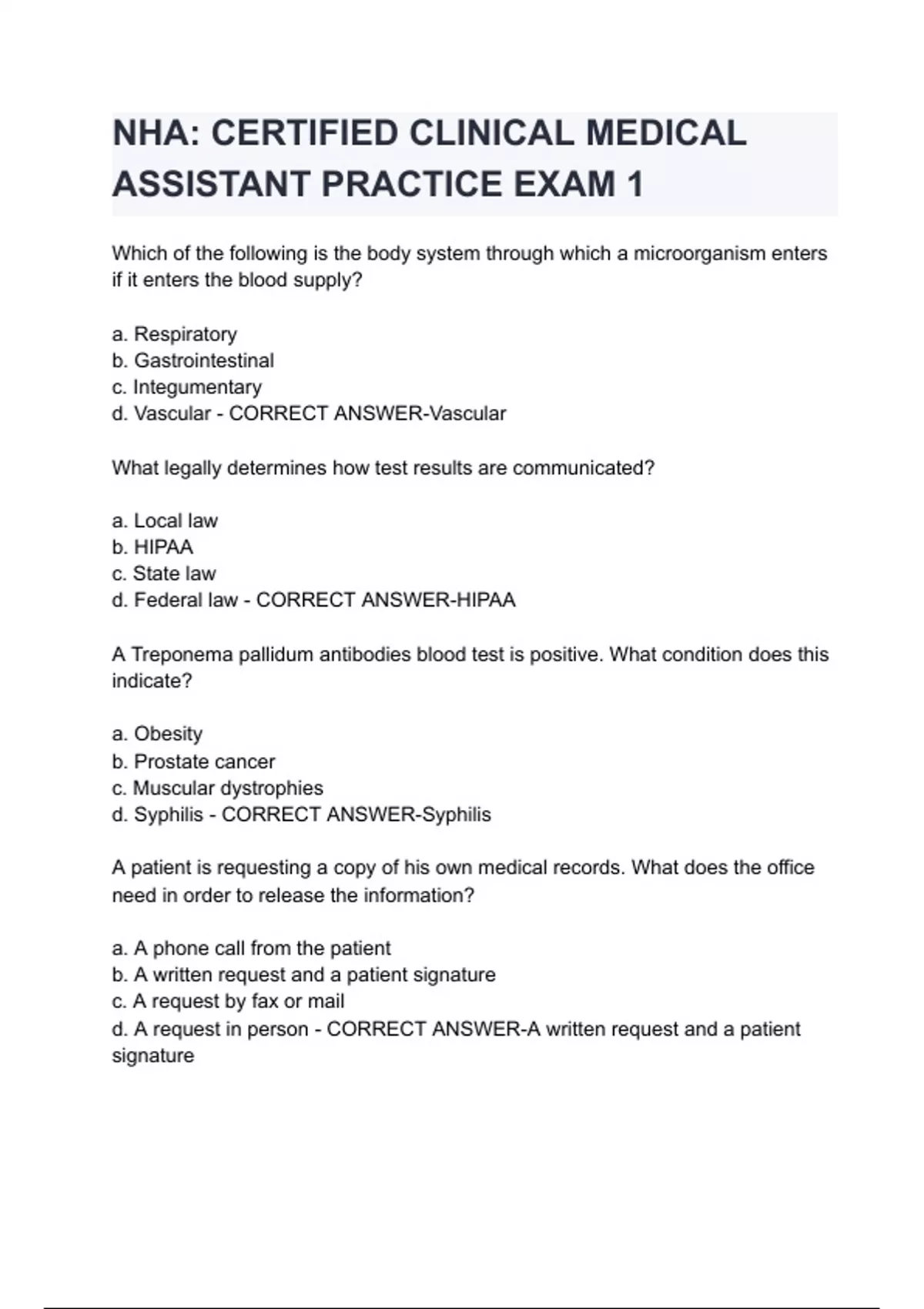 NHA: CERTIFIED CLINICAL MEDICAL ASSISTANT PRACTICE EXAM 1 Questions and Answers