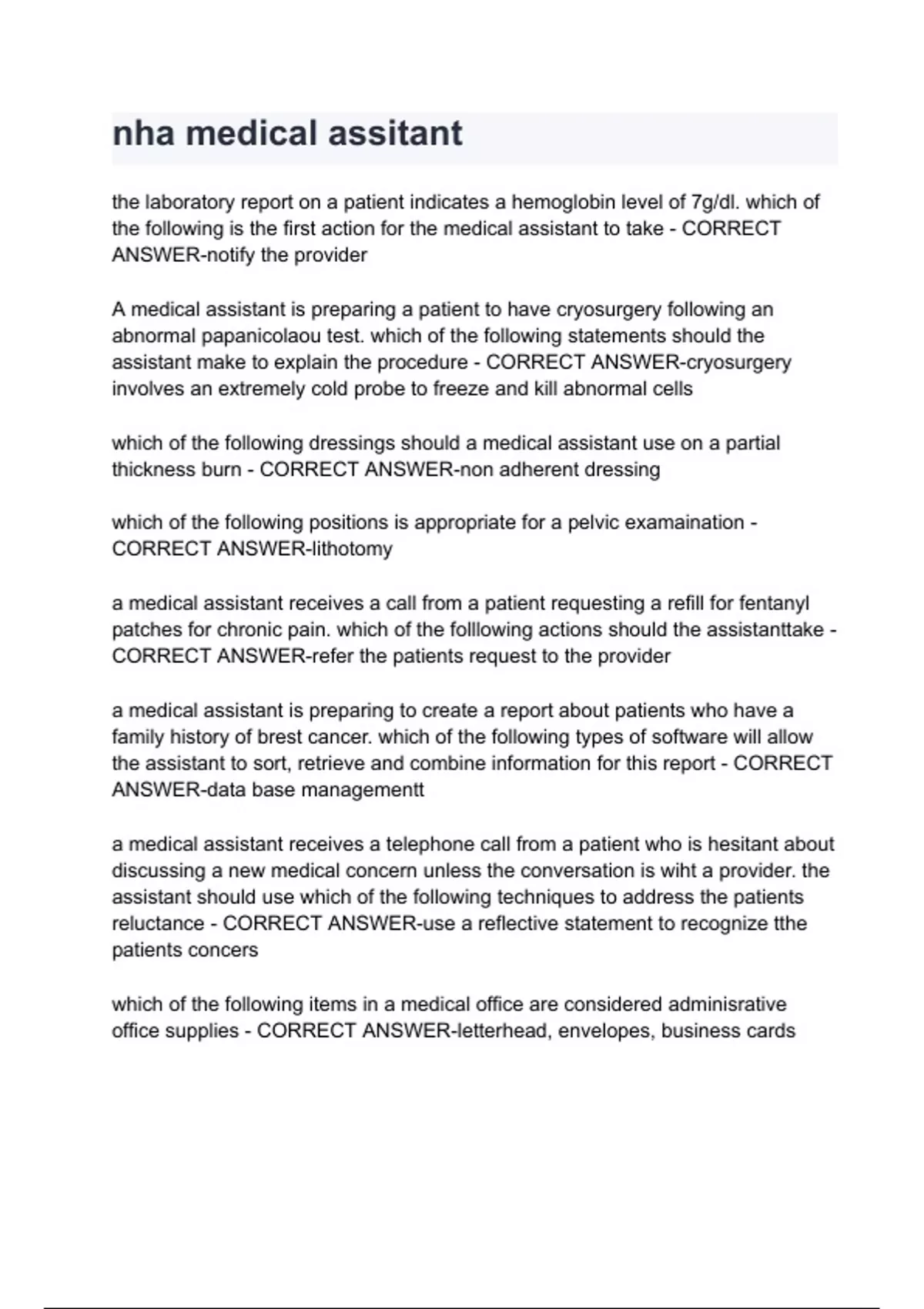 nha medical assitant questions and answers latest 2024