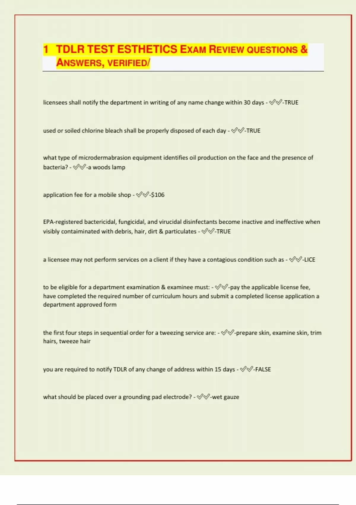 TDLR TEST ESTHETICS EXAM REVIEW QUESTIONS & ANSWERS, VERIFIED/ licensees shall notify the department in writing of any name change within 30 days - -TRUE used or soiled chlorine bleach shall be properly disposed of each day - -TRUE what type of microdermabrasion equipment identifies oil production on the face and the presence of bacteria? - -a woods lamp application fee for a mobile shop - -$106 EPA-registered bactericidal, fungicidal, and virucidal disinfectants become inactive and ineffective when visibly contaiminated with debris, hair, dirt & particulates - -TRUE a licensee may not perform services on a client if they have a contagious condition such as - -LICE to be eligible for a department examination & examinee must: - -pay the applicable license fee, have completed the required number of curriculum hours and submit a completed license application a department approved form the first four steps in sequential order for a tweezing service are: - -prepare skin, examine skin, trim hairs, tweeze hair you are required to notify TDLR of any change of address within 15 days - -FALSE what should be placed over a grounding pad electrode? - -wet gauz