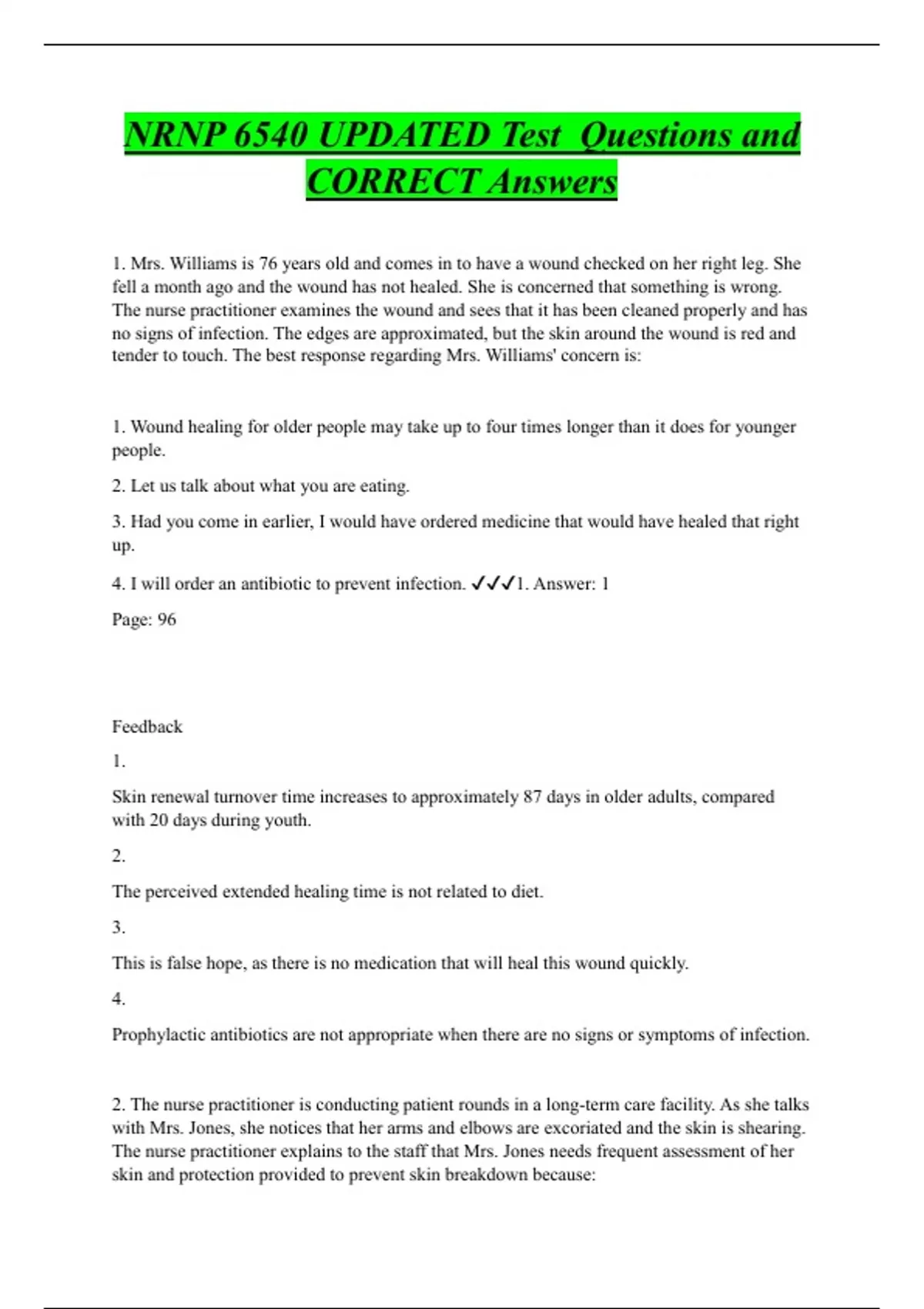 1. Mrs. Williams is 76 years old and comes in to have a wound checked on her right leg. She fell a month ago and the wound has not healed. She is concerned that something is wrong. The nurse practitioner examines the wound and sees that it has been cleaned properly and has no signs of infection. The edges are approximated, but the skin around the wound is red and tender to touch. The best response regarding Mrs. Williams' concern is: 1. Wound healing for older people may take up to four times longer than it does for younger people. 2. Let us talk about what you are eating. 3. Had you come in earlier, I would have ordered medicine that would have healed that right up. 4. I will order an antibiotic to prevent infection. 1. Answer: 1 Page: 9