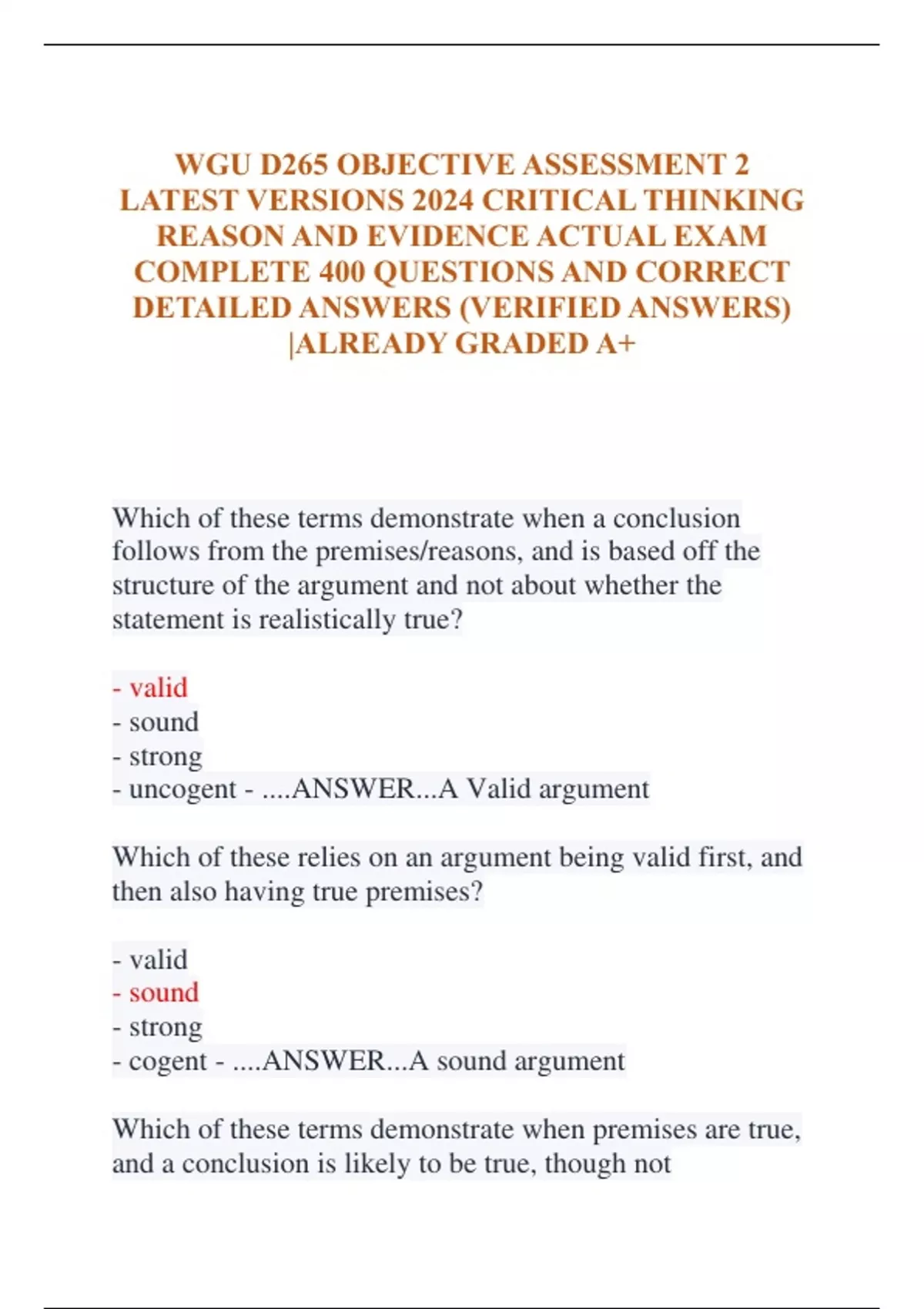WGU D265 OBJECTIVE ASSESSMENT 2 LATEST VERSIONS 2024 CRITICAL THINKING REASON AND EVIDENCE ACTUAL EXAM COMPLETE 400 QUESTIONS AND CORRECT DETAILED ANSWERS (VERIFIED ANSWERS) |ALREADY GRADED A+
