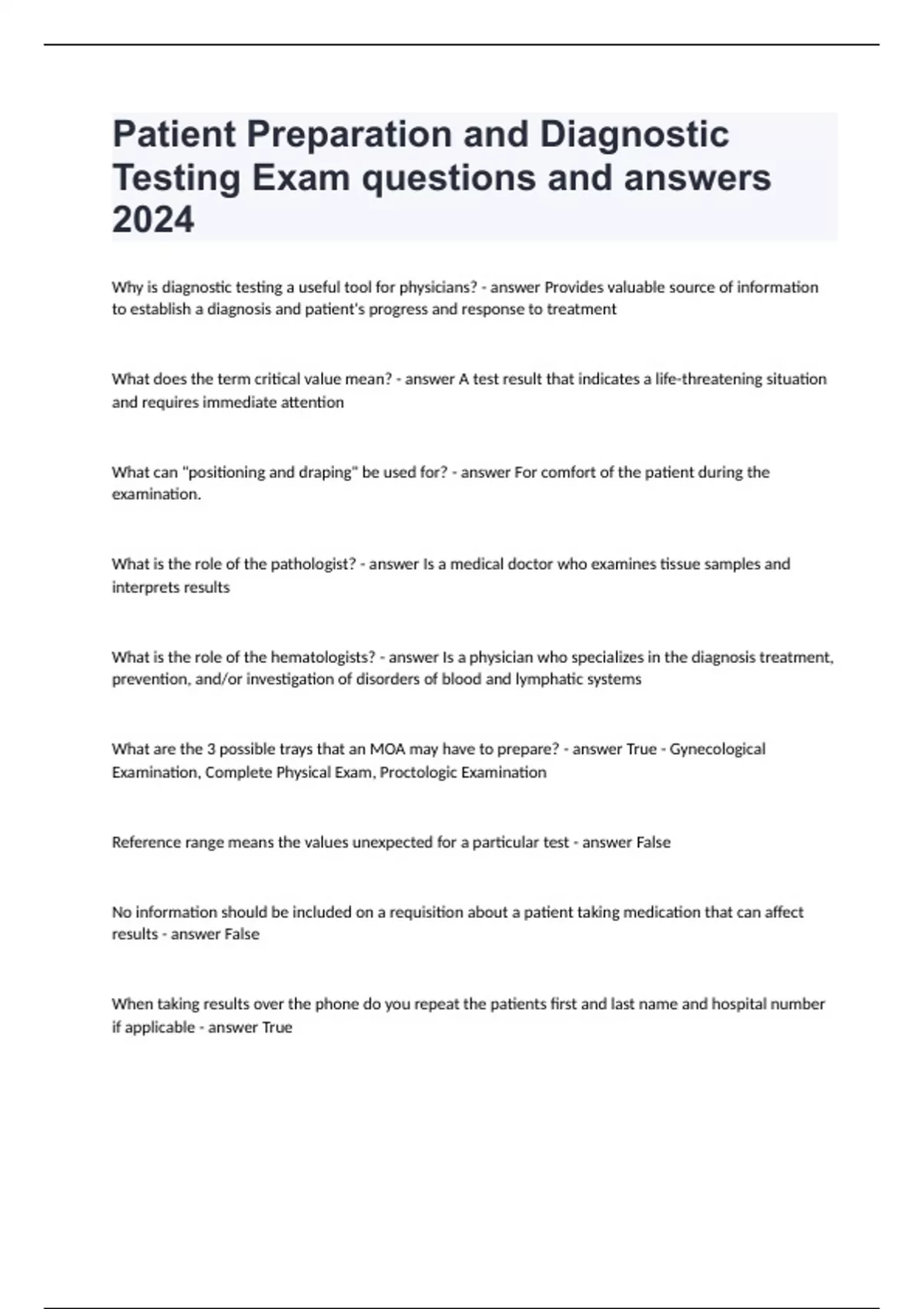 Patient Preparation and Diagnostic Testing Exam questions and answers 2024