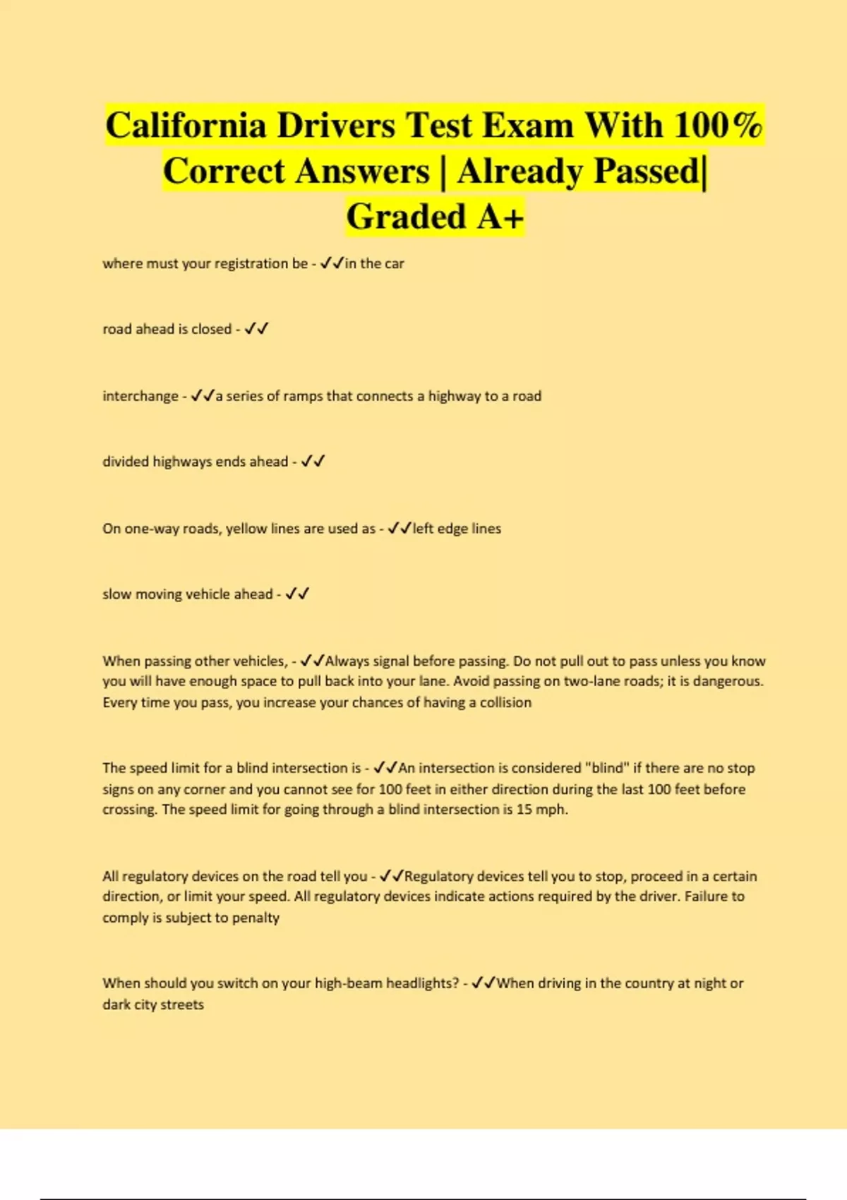 California Drivers Test Exam With 100% Correct Answers | Already Passed| Graded A+