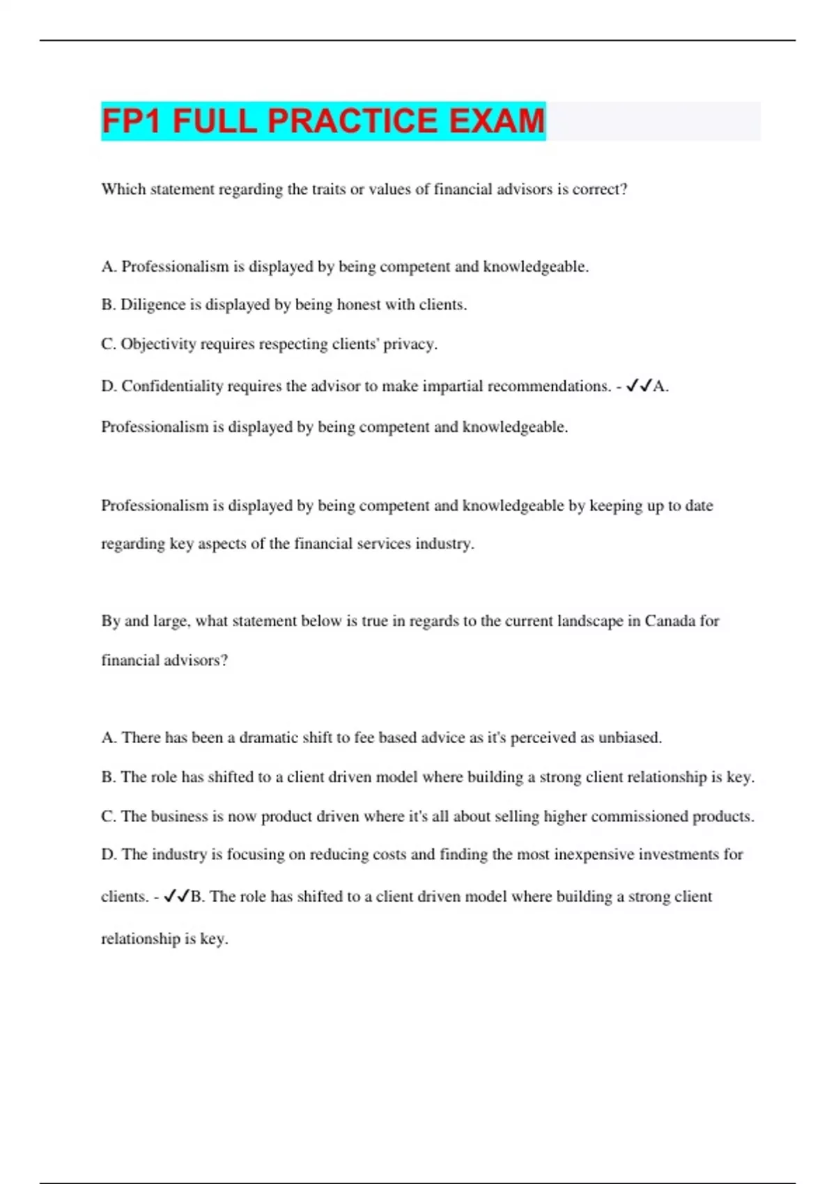 FP1 FULL PRACTICE EXAM Which statement regarding the traits or values of financial advisors is correct? A. Professionalism is displayed by being competent and knowledgeable. B. Diligence is displayed by being honest with clients. C. Objectivity requires respecting clients' privacy. D. Confidentiality requires the advisor to make impartial recommendations. - A. Professionalism is displayed by being competent and knowledgeable. Professionalism is displayed by being competent and knowledgeable by keeping up to date regarding key aspects of the financial services industry. By and large, what statement below is true in regards to the current landscape in Canada for financial advisors? A. There has been a dramatic shift to fee based advice as it's perceived as unbiased. B. The role has shifted to a client driven model where building a strong client relationship is key. C. The business is now product driven where it's all about selling higher commissioned products. D. The industry is focusing on reducing costs and finding the most inexpensive investments for clients. - B. The role has shifted to a client driven model where building a strong client relationship is key. The role of the Advisor in the financial services industry has changed in recent years from one that is product driven to one that is client driven. Reference: Module 1, Section 1 Which statements about the evolution of the role of financial advisors is/are correct? [I] The financial services industry has moved towards an integrated market and so have advisors. [II] Advisors have fewer products and services to offer to clients. [III] Advisors require a greater level of knowledge to recommend sophisticated alternatives to clients. A. I only. B. I and III only. C. II and III only. D. I and II only. - B. I and III only. Advisors have to work within a highly integrated financial services market and must possess a much higher level of knowledge than before to satisfy increasingly sophisticated clients. Select the first step in the financial planning process. A. Analyzing a client's data and information. B. Recommending strategies to meet goals. C. Establishing a relationship with the client. D. Collecting a client's data and information. - C. Establishing a relationship with the client. The first step in the financial planning process is for an advisor to establish a relationship with the client; everything else follows. Select the item that would provide you with quantitative data about your new client. A. Profit sharing plan statement. B. Risk tolerance assessment. C. Goal setting questionnaire. D. Fees and services agreement. - A. Profit sharing plan statement. Only the profit-sharing statement would provide you with quantitative data, i.e. numeric or other specific data that can be quantified. The other options would provide qualitative data. Reference: Module 1, Section 2. Your client's goal is to improve her cash flow. Select the strategy that will be most effective in helping her to reach her goal. A. Improve investment return. B. Reduce flexible expenses and lengthen time frame for investments. C. Increase income and reduce expenses. D. Contribute regularly to an emergency fund. - C. Increase income and reduce expenses. Cash flow is the amount of money available for investment or other purposes. In this scenario, the client is best able to free up money for investments by increasing the amount of money coming in (income) and reducing the amount of money going out (expenses). While (b) would improve cash flow by reducing some expenses, the addition of the increase in income in (c) makes it more effective. Kim does not recommend an investment fund to her clients that is heavily promoted by her own firm's marketing department because her analysis demonstrates that it is not consistent for her clients' goals. Select the type of responsibility that she is demonstrating. A. Integrity. B. Professionalism. C. Objectivity. D. Diligence. - C. Objectivity. Kim is fulfilling the responsibility of "Objectivity" which states that an adviser must not make recommendations that benefit the adviser or the adviser's institution when there are other products and services that might serve an adviser's clients better. Reference: Module 1, Section 2. Select the most useful goal for setting investment priorities. A. "I'm not sure when we'll retire, but we want to be able to travel for 10 or so years at that time." B. "We want to buy a big house in a nice neighbourhood" C. "We will need 70% of our current income level to retire and maintain our lifestyle." D. "I want to be able to retire comfortably based on my current lifestyle." - C. "We will need 70% of our current income level to retire and maintain our lifestyle." General Feedback: Options a, b, and d are not measurable or quantifiable; only c is measurable and quantifiable. Thus, only "c" is usual for setting priorities. Encouraging clients to set specific, measurable targets instead of vague and general goals serves