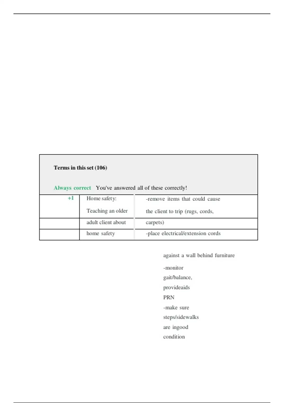 Terms in this set (106) Always correct You've answered all of these correctly! +1 Home safety: Teaching an older -remove items that could cause the client to trip (rugs, cords, adult client about carpets) home safety -place electrical/extension cords against a wall behind furniture -monitor gait/balance, provideaids PRN -make sure steps/sidewalks are ingood condition g +1 Safe Medication Administration & Error Reduction: Appropriate Actions Followinga Medication Error -assess client -inform charge nurse -complete incident report No Answers Yet You still haven't studied these! Normal level forWBC's 4,500 - 11,000 Normal lab valuesfor Hbg male 13.5-17.5 g/dL Normal lab valuesfor Hbg female 12-16 g/dL Normal lab valuesfor Na 135-145 mEq/L Normal lab valuesfor K 3.5-5 mEq/L Normal lab valuesforCl 95-105 mEq/L Normal lab valuesforHCO3 22-29 mEq/L Normal BUN labvalues 7-18 mg/dL Normal Creatinelab values 0.6- 1.2 mg/dL Normal Glucoselab values 70-110 mg/dL Normal Calciumlab values 8.5-10.5 mg/dL