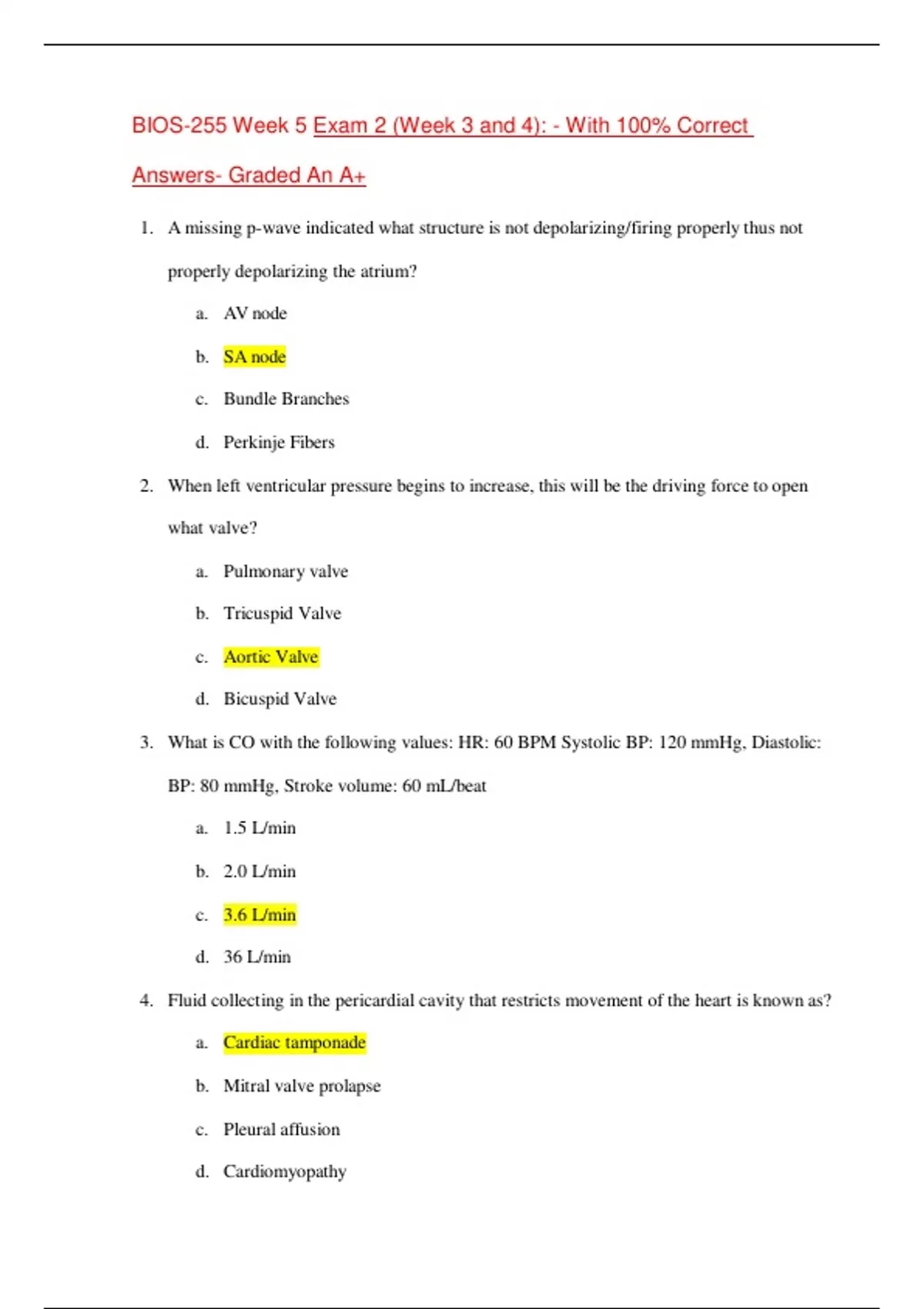 BIOS-255 Week 5 Exam 2 (Week 3 and 4): - With 100% Correct Answers- Graded An A+ 1. A missing p-wave indicated what structure is not depolarizing/firing properly thus not properly depolarizing the at rium? a. AV node b. SA node c. Bundle Branches d. Perkinje Fibers 2. When left ventricular pressure begins to increase, this will be the driving force to open what valve? a. Pulmonary valve b. Tricuspid Valve c. Aortic Valve d. Bicuspid Valve 3. What is CO with the following values: HR: 60 BPM Systolic BP: 120 mmHg, Diastolic: BP: 80 mmHg, Stroke volume: 60 mL/beat a. 1.5 L/min b. 2.0 L/min c. 3.6 L/min d. 36 L/min 4. Fluid collecting in the pericardial cavity that restricts movement of the heart is known as? a. Cardiac tamponade b. Mitral valve prolapse c. Pleural affusion d. Cardiomyopathy 5. Structure that permits blood flow from right atrium to the left atrium in fetal circulation? a. Foramen ovale b. Interatrial septum c. Coronary sinus d. Fossa ovalis 6. Blood leaves the right ventricle by passing through which of the following valves? Exam question a. Aortic Valve b. Pulmonary Valve c. Mitral Valve d. Tricuspid Valve 7. The cusps (leaflets) of atrioventricular valves attach directly to the ? a. Papillary muscle b. Trabeculae carneae c. Chordae tendineae d. Coronary sulci 8. Contraction of papillary muscles: a. Close the atrioventricular valves b. Close the semilunar valves c. Eject blood from the ventricles d. Prevents the atrioventricular valve eversion 9. The visceral pericardium is the same as the: a. Mediastinum b. Parietal pericardium c. Epicardium d. Myocardium 10. The left ventricle pumps blood to the ? a. Lungs b. Right ventricle c. Right atrium d. Aorta 11. When ventricular pressure drops to less than atrial pressure, the AV valves then ? a. Close b. Open c. Make the third heart sound d. Contract 12. The pulmonary semilunar valve prevents backward flow into the ? a. Aorta b. Pulmonary trunk c. Pulmonary veins d. Right ventricle 13. In an EKG trace, the p-wave represents what? a. Ventricular depolarization b. Ventricular repolarization c. Atrial depolarization d. Atrial repolarization 14. In an EKG trace, the QRS-complex represents what? a. Ventricular depolarization b. Ventricular repolarization c. Atrial depolarization d. Atrial repolarization 15. The second nodal tissue structure to depolarize during one cardiac cycle is the ? a. Perkinje fibers b. SA node c. AV node d. Bundle branches 16. A heartrate that is above 100 beats per minute is known as what? a. Tachycardia b. Bradycardia c. Atrial vibrations 17. The expandable extension of an atrium is called what? a. Apex b. Base c. Auricle d. Fossa ovalis 18. Each of the following will increase cardiac output EXCEPT: a. Increased sympathetic stimulation b. Increased venous return c. Increased parasympathetic simulation d. Increased heart rate 19. Cardiac muscle generate ATP via and . a. Aerobic cellular respiration and citric acid cycle b. Anaerobic cellular respiration and creating phosphate c. Creatine phosphate and The Afterburn cycle d. Glycolysis and glucose 20. This blood vessel carries blood away from the heart a. Veins b. Arteries c. Venules d. Capillaries 21. What type of circulation carries O2 and nutrients to body tissues and removes CO2 and wastes? a. Fetal circulation b. Pulmonary circulation c. Hepatic portal circulation d. Systemic circulation 22. The outer most layer of a blood vessel is? a. Tunica externa b. Tunica media c. Tunica interna d. Tunica outsidia 23. Which arteries are the largest in the body? Exam question a. Muscular arteries b. Pulmonary artery c. Brachial artery d. Elastic arteries 24. Where is your brachial artery located? a. Posterior to the knee b. Lateral to the larynx c. Medial side of the biceps brachii d. Medial to ear 25. Which one of these is NOT a type of shock? a. Adrenal shock b. Cardiogenic shock c. Vascular shock d. Obstructive shock 26. What is vasoconstriction? Exam question a. The increase of the lumen in diameter b. The distribution of blood to various parts of the body c. The volume of blood that flows through tissue at any given time d. The decrease in the diameter of the lumen of a blood vessel 27. Failure of the CV system to deliver enough O2 and nutrients to meet cellular metabolism results in: Exam question a. Bradycardia b. Aneurysm c. Hypotension d. Shock 28. The main control of peripheral resistance occurs in the a. Arterioles b. Venules c. Veins d. Capillaries 29. Resistance acts to: a. Increases blood flow b. Decreases blood flow c. Never changes in a blood vessel d. Acts with pressure to move blood along a vessel 30. The sites of exchange between the blood and the tissues are the a. Arteries b. Arterioles c. Capillaries d. Venules 31. Veins? a. Carry blood toward the heart b. Have thick layers of smooth muscle in the tunica medica c. Hemoglobin d. Have thin layers of connective tissue in the tunica externa 32. The volume of blood flowing back to the heart through systemic veins is called . a. Microcirculation b. Venus return c. Pulmonary circulation d. Venus input 33. Monitors move of joints and muscles provide input to the CV center during physical activity. a. Proprioceptors b. Chemoreceptor c. Respiratory receptors d. Filtration 34. Which option is venous return assisted by? a. Skeletal muscle pump b. Respiratory pump c. Valves d. All of the above 35. The development of blood cells and the formation of blood vessels come from which germ layer? Exam question a. Mesoderm b. Endoderm c. Ectoderm d. Epiderm 36. Which best describes a lymph node? a. A type of pathogen that attacks the immune system b. A special kind of immune cell that is found in the lymph c. A capsule in lymph vessels filled with B cells and T cells 37. What is edema? a. Swelling b. Removing of lymph nodes c. Cancer d. Part of the lymphatic system 38. Lymph flow is maintained by a. Pressure changes in the veins b. Viscosity of lymph c. Pressure changes during breathing d. Length of vessel 39. Lympha