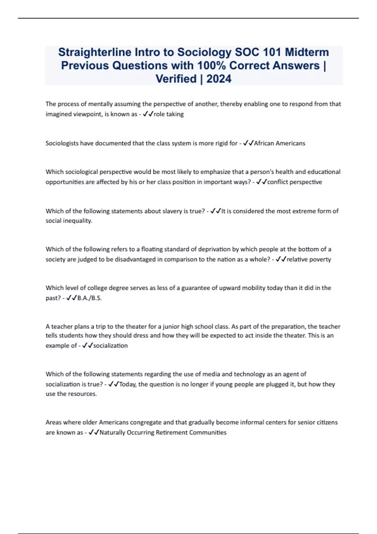 Straighterline Intro to Sociology SOC 101 Midterm Previous Questions with 100% Correct Answers | Verified | 2024