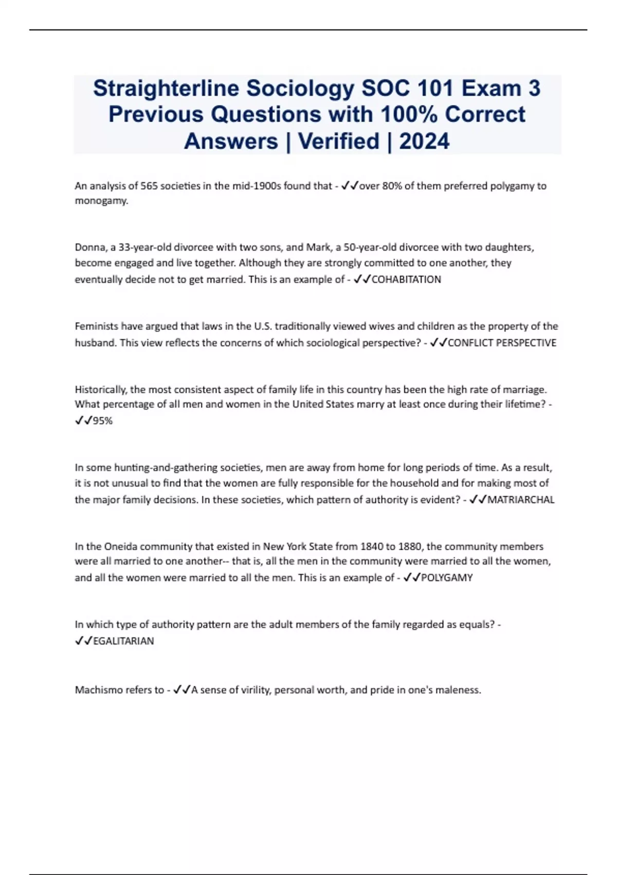 Straighterline Sociology SOC 101 Exam 3 Previous Questions with 100% Correct Answers | Verified | 2024