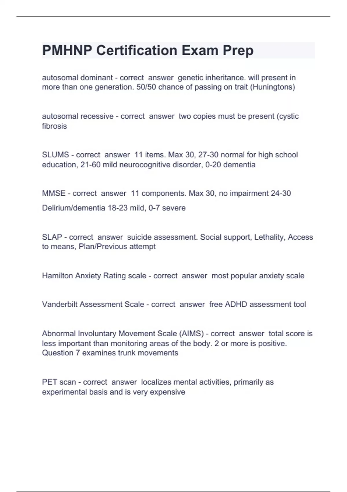 PMHNP Certification Exam Prep Question and answers 100% correct 2024 autosomal dominant - correct answer genetic inheritance. will present in more than one generation. 50/50 chance of passing on trait (Huningtons) autosomal recessive - correct answer two copies must be present (cystic fibrosis SLUMS - correct answer 11 items. Max 30, 27-30 normal for high school education, 21-60 mild neurocognitive disorder, 0-20 dementia MMSE - correct answer 11 components. Max 30, no impairment 24-30 Delirium/dementia 18-23 mild, 0-7 severe SLAP - correct answer suicide assessment. Social support, Lethality, Access to means, Plan/Previous attempt Hamilton Anxiety Rating scale - correct answer most popular anxiety scale Vanderbilt Assessment Scale - correct answer free ADHD assessment tool Abnormal Involuntary Movement Scale (AIMS) - correct answer total score is less important than monitoring areas of the body. 2 or more is positive. Question 7 examines trunk movements PET scan - correct answer localizes mental activities, primarily as experimental basis and is very expensive