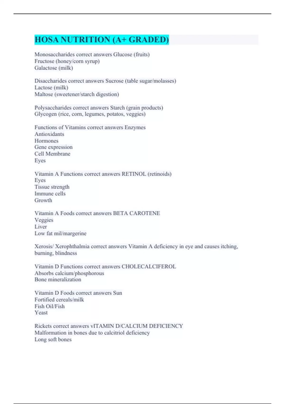 Monosaccharides correct answers Glucose (fruits) Fructose (honey/corn syrup) Galactose (milk) Disaccharides correct answers Sucrose (table sugar/molasses) Lactose (milk) Maltose (sweetener/starch digestion) Polysaccharides correct answers Starch (grain products) Glycogen (rice, corn, legumes, potatos, veggies) Functions of Vitamins correct answers Enzymes Antioxidants Hormones Gene expression Cell Membrane Eyes Vitamin A Functions correct answers RETINOL (retinoids) Eyes Tissue strength Immune cells Growth Vitamin A Foods correct answers BETA CAROTENE Veggies Liver Low fat mil/margerine Xerosis/ Xerophthalmia correct answers Vitamin A deficiency in eye and causes itching, burning, blindness Vitamin D Functions correct answers CHOLECALCIFEROL Absorbs calcium/phosphorous Bone mineralization Vitamin D Foods correct answers Sun Fortified cereals/milk Fish Oil/Fish Yeast Rickets correct answers vITAMIN D/CALCIUM DEFICIENCY Malformation in bones due to calcitriol deficiency Long soft bones