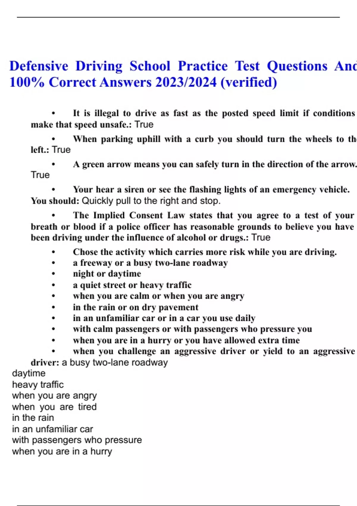Defensive Driving School Practice Test Questions and Answers (2023/2024) (Verified Answers)