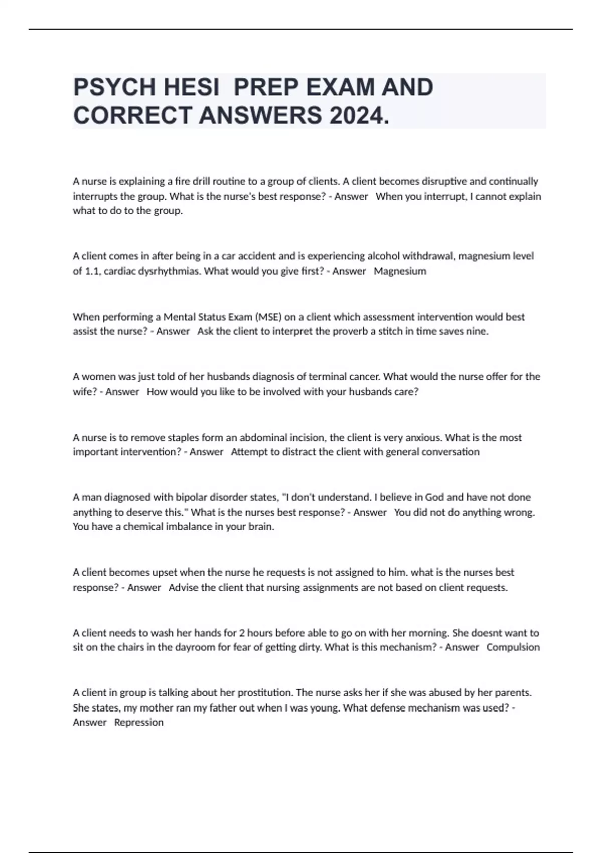 A nurse is explaining a fire drill routine to a group of clients. A client becomes disruptive and continually interrupts the group. What is the nurse's best response? - Answer When you interrupt, I cannot explain what to do to the group. A client comes in after being in a car accident and is experiencing alcohol withdrawal, magnesium level of 1.1, cardiac dysrhythmias. What would you give first? - Answer Magnesium When performing a Mental Status Exam (MSE) on a client which assessment intervention would best assist the nurse? - Answer Ask the client to interpret the proverb a stitch in time saves nine. A women was just told of her husbands diagnosis of terminal cancer. What would the nurse offer for the wife? - Answer How would you like to be involved with your husbands care? A nurse is to remove staples form an abdominal incision, the client is very anxious. What is the most important intervention? - Answer Attempt to distract the client with general conversation A man diagnosed with bipolar disorder states, "I don't understand. I believe in God and have not done anything to deserve this." What is the nurses best response? - Answer You did not do anything wrong. You have a chemical imbalance in your brain. A client becomes upset when the nurse he requests is not assigned to him. what is the nurses best response? - Answer Advise the client that nursing assignments are not based on client requests. A client needs to wash her hands for 2 hours before able to go on with her morning. She doesnt want to sit on the chairs in the dayroom for fear of getting dirty. What is this mechanism? - Answer Compulsion A client in group is talking about her prostitution. The nurse asks her if she was abused by her parents. She states, my mother ran my father out when I was young. What defense mechanism was used? - Answer Repression