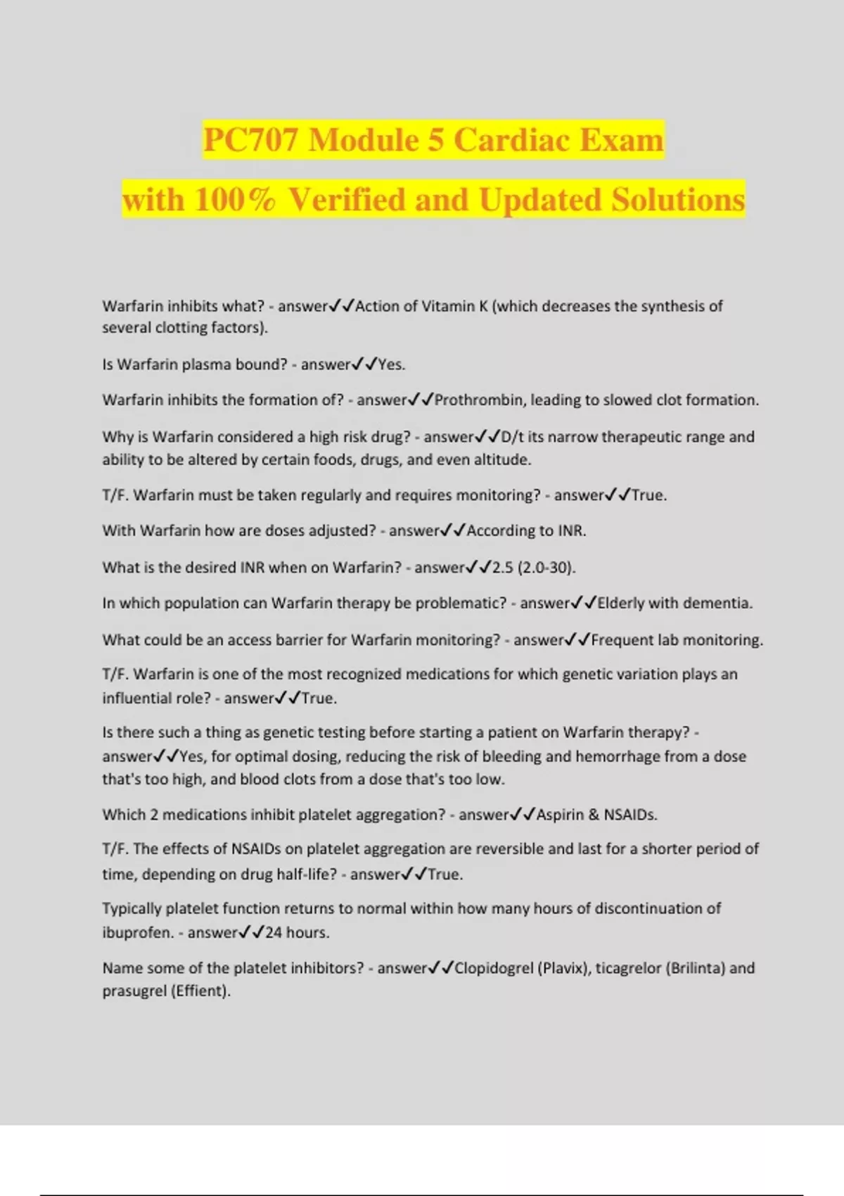 PC707 Module 5 Cardiac Exam with 100% Verified and Updated Solutions Warfarin inhibits what? - answerAction of Vitamin K (which decreases the synthesis of several clotting factors). Is Warfarin plasma bound? - answerYes. Warfarin inhibits the formation of? - answerProthrombin, leading to slowed clot formation. Why is Warfarin considered a high risk drug? - answerD/t its narrow therapeutic range and ability to be altered by certain foods, drugs, and even altitude. T/F. Warfarin must be taken regularly and requires monitoring? - answerTrue. With Warfarin how are doses adjusted? - answerAccording to INR. What is the desired INR when on Warfarin? - answer2.5 (2.0-30). In which population can Warfarin therapy be problematic? - answerElderly with dementia. What could be an access barrier for Warfarin monitoring? - answerFrequent lab monitoring. T/F. Warfarin is one of the most recognized medications for which genetic variation plays an influential role? - answerTrue. Is there such a thing as genetic testing before starting a patient on Warfarin therapy? - answerYes, for optimal dosing, reducing the risk of bleeding and hemorrhage from a dose that's too high, and blood clots from a dose that's too low. Which 2 medications inhibit platelet aggregation? - answerAspirin & NSAIDs. T/F. The effects of NSAIDs on platelet aggregation are reversible and last for a shorter period of time, depending on drug half-life? - answerTrue. Typically platelet function returns to normal within how many hours of discontinuation of ibuprofen. - answer24 hours. Name some of the platelet inhibitors? - answerClopidogrel (Plavix), ticagrelor (Brilinta) and prasugrel (Effient). Platelet inhibitors is added to ASA after? - answerAcute coronary syndrome. Which platelet inhibitors has been used the most and why? - answerClopidogrel (Plavix). First drug around and it has been used the most. Which platelet inhibitor is more effective? - answerTicagrelor (Brilinta). - Prevents 11 more cardiovascular deaths - Prevents 11 more MIs - Prevents 6 more thromboses after stent placement What are the newer generations of anticoagulants? - answerDabigatran, rivaroxaban and apixaban. Do the newer generation of anticoags need INR monitoring? - answerNo. Is there in increased risk of under or over dosing? - answerNo, it is decreased. Compared to Warfarin which has half-life of 40 hours, what is the half-life for newer generations? - answerShort-acting and have short half-lives of only 12 hours, which may contribute to higher rates of strokes if not adhering correctly. Initial dosage varies widely among patients. Its based on factors such as? - answerAge Race Body weight Sex Genotype Concomitant drugs Indication ACCP recommends average starting dose for Warfarin is? - answer5 mg. Warfarin dosage should be lowered for whom? - answerElderly CHF Malnourished Liver disease Recent major surgery Certain drugs After getting baseline INR, when should your next INR check be for Warfarin and then? - answerAfter two or three doses, twice weekly (until within therapeutic INR levels), weekly, q other week, finally monthly. Which herbs need to be watched when taking Warfarin? - answerGarlic, gingko, vit. E. Patient education for Warfarin include? - answerGreens can impact clotting time. Use electric razor, no ASA or NSAIDs, monitor for bleeding, wear bracelet, or keep medication card in wallet. What's the deal with Heparin? - answer- Used less often in primary care. - Has the advantage of being inexpensive, but must be given IV or subcutaneously. - Has a very short half life, allowing for rapid induction of anticoagulation and reversal. What's the deal with Lovenox? - answer- Often substituted for heparin. - Administered subcutaneously. - Administered only once or twice daily (unlike heparin which requires qid or continuous IV dosing). - It does not require monitoring. - Despite its significantly higher cost, enoxaparin can reduce overall health costs as it does not require hospitalization. Lovenox and Fragmin in pregnancy? - answerBoth are cate B (per Lexicomp). What are the risk for these two LMWH? - answerBleeding, hemorrhage and thrombocytopenia. Heparin (cate. C) is used for what in pregnancy? - answerPrevention of VTE for those at risk, treatment of emergency thrombotic events such as DVT and PE, and prophylactic treatment for history of thrombosis or certain congenital thrombophilias. Is an anesthesiologist required to be consulted for LMWH? - answerYes. D/t complications associated with low-molecular weight heparin. Is Heparin (cate. C) considered safe during pregnancy and lactation. - answerYes. Coumadin in pregnancy? - answerNo. Cate. X. Fetal Warfarin syndrome? - answerInclude facial malformations and associated airway obstruction and neonatal respiratory difficulties. T/F. If possible, both warfarin and heparin should be avoided with imminent or possible abortion or miscarriage. - answerTrue. When Warfarin is prescribed postpartum (after 6 weeks d/t hx of thrombosis) what do you need to watch for in the infant? - answerPetechiae and ecchymoses. Conditions leading to HF? - answerHypertension CAD Idiopathic cardiomyopathy MI PE Sepsis Certain drugs T/F. Compensatory mechanisms for the conditions listed result in worsening of heart failure. - answerTrue. Which labs can be ordered to see the overall picture of a pt's CHF? - answerBNP or proBNP. Stage A - high risk for HF without structural disease or symptoms, how do you proceed? - answerTreat hypertension. Encourage smoking cessation. Treat lipid disorders. Encourage exercise. Discourage alcohol or illicit drug use. ACE Inhibitor in appropriate patients. Stage B - Structural disease but have not developed symptoms of HF, how do you proceed? - answerAll measures under Stage A. Ace Inhibitors in appropriate patients. Beta blockers may be added. Stage C - Structural disease with prior or current symptoms of HF, how do you proceed? - answerAll measures under Stage A. Salt restriction. Drugs for regu