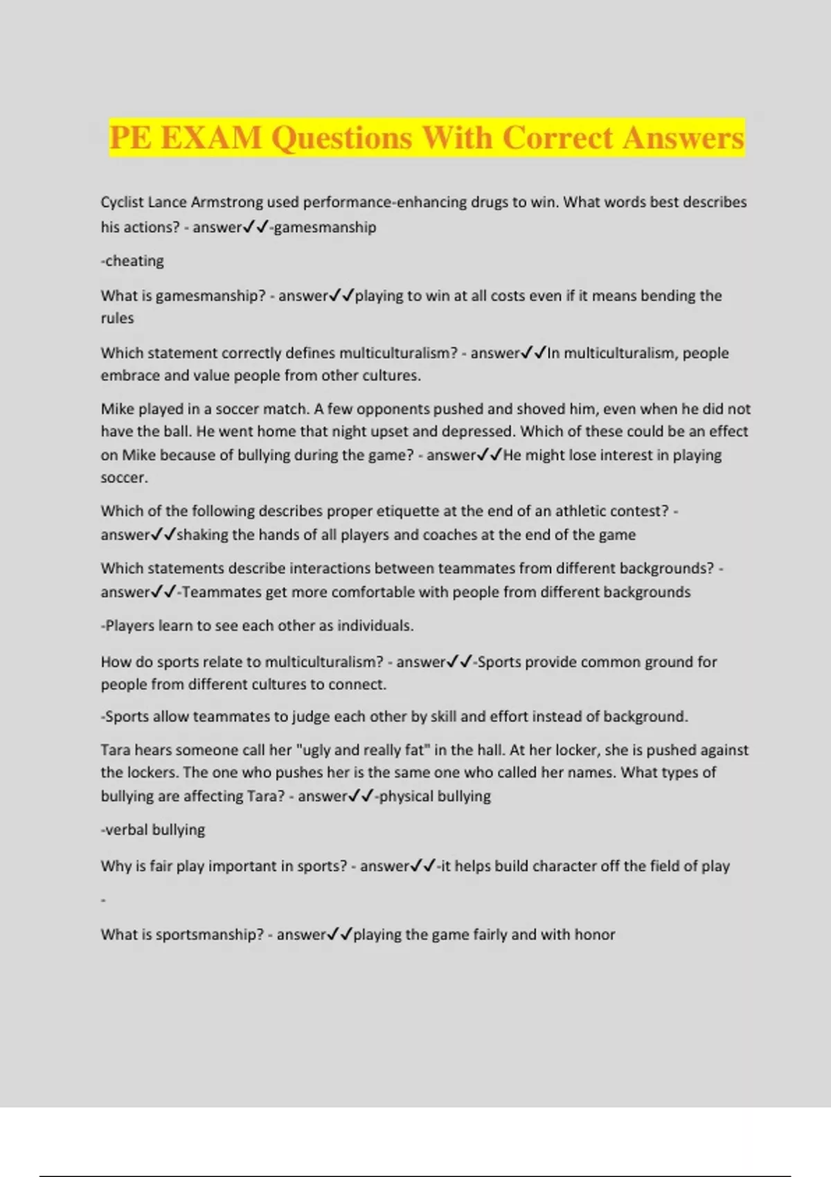 PE EXAM Questions With Correct Answers Cyclist Lance Armstrong used performance-enhancing drugs to win. What words best describes his actions? - answer-gamesmanship -cheating What is gamesmanship? - answerplaying to win at all costs even if it means bending the rules Which statement correctly defines multiculturalism? - answerIn multiculturalism, people embrace and value people from other cultures. Mike played in a soccer match. A few opponents pushed and shoved him, even when he did not have the ball. He went home that night upset and depressed. Which of these could be an effect on Mike because of bullying during the game? - answerHe might lose interest in playing soccer. Which of the following describes proper etiquette at the end of an athletic contest? - answershaking the hands of all players and coaches at the end of the game Which statements describe interactions between teammates from different backgrounds? - answer-Teammates get more comfortable with people from different backgrounds -Players learn to see each other as individuals. How do sports relate to multiculturalism? - answer-Sports provide common ground for people from different cultures to connect. -Sports allow teammates to judge each other by skill and effort instead of background. Tara hears someone call her "ugly and really fat" in the hall. At her locker, she is pushed against the lockers. The one who pushes her is the same one who called her names. What types of bullying are affecting Tara? - answer-physical bullying -verbal bullying Why is fair play important in sports? - answer-it helps build character off the field of play - What is sportsmanship? - answerplaying the game fairly and with honor The Bobcats won the state championships. Many team members took performance-enhancing drugs. Others faked injuries to get referees to call fouls. Are the Bobcats truly winners? - answerThe Bobcats are not truly winners because they cheated. How do sports help people become comfortable with other cultures? - answerSports cause people from minority cultures to change their behavior. Kyle logs onto his social media account. He sees someone post a comment that says, "Kyle wore the ugliest sweater to school today. Why would anyone hangout with him?" What type of bullying is this? - answercyberbullying How do basketball players score? - answerby shooting a ball through a hoop What is the main goal in football? - answerthrowing or carrying a ball into the end zone or kicking it through the goalposts In order to win a game, what is the main objective of a team that plays hockey or soccer? - answerto score more goals than the opponent Why might players pass the puck or ball in hockey or soccer? - answerto get past defenders What is a boxer's main objective? - answerto punch until their opponent cannot keep fighting What is the main objective of MMA? - answerto kick, grab, or punch opponents until they are unable to fight What type of injuries is most common in hockey and soccer? - answermuscle strains What are the two main defensive strategies in basketball? - answerzone defense and man- to-man defense What are physical demands of combat sports? - answer-speed -flexibility What type of football injury can lead to lasting problems with memory and concentration? - answerconcussion What physical abilities are most important for baseball players? - answerspeed aerobic endurance fast reaction time What physical attributes are most important for combat sports like MMA, boxing, and wrestling? - answerstrength strength Which options show an offensive strategy? - answer-passing the ball or puck side to side -sending the ball or puck long What strategy do boxers use to win a match? - answerknowing when and where to punch an opponent Which injuries are common in contact sports? - answerjoint injuries head injuries facial injuries Which muscles work hardest during a soccer game? - answerleg muscles Which answers are physical traits that are important when playing golf? - answer-having excellent hand-eye coordination -strength to hit the ball long distances What is the main objective of the game of golf? - answerto put the ball into the cup using as few strokes as possible What is the main objective of tennis? - answerto win more games, sets, and matches than the opponent What is the main objective of volleyball? - answerscoring more points than the other team and winning two of three or three of five games What is the objective of badminton? - answerto reach 21 points using a shuttlecock and racket before the opponent Mark tosses a small plastic ball in the air. He strikes the ball with a paddle. It bounces once on a hard table and flies over a net. The ball bounces on the other side of the net, and Mark's opponent hits it. Play continues. Each time the ball is missed or goes out of bounds, a player gets a point. Mark wins when the score is 11 to 8. What sport is Mark playing? - answertable tennis In which event do male gymnasts swing their body over a rectangular block with two handles? - answerpommel horse How does regular physical activity impact forms of cardiovascular disease? - answer- increases HDL cholesterol -reduces blood pressure