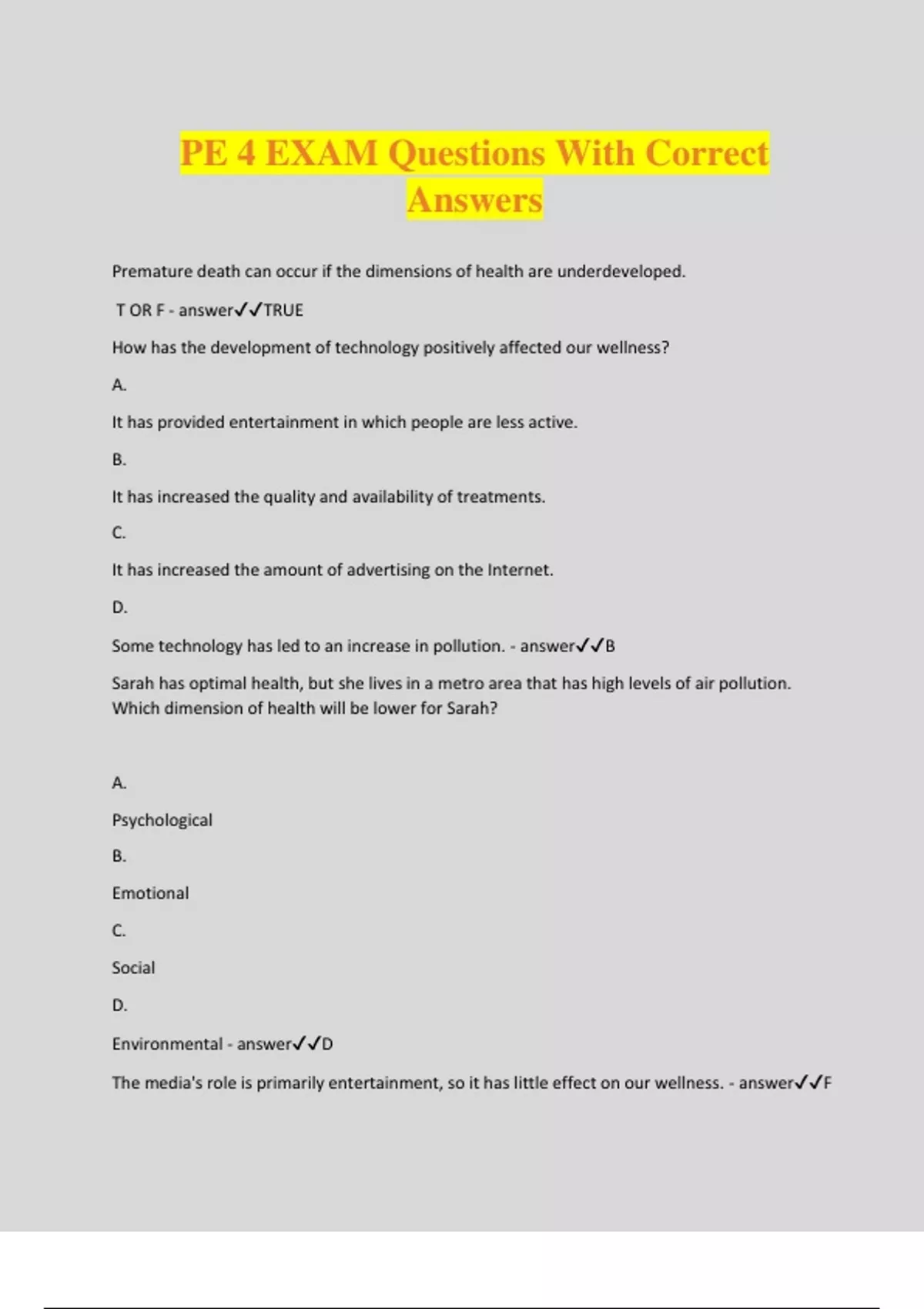 PE 4 EXAM Questions With Correct Answers Premature death can occur if the dimensions of health are underdeveloped. T OR F - answerTRUE How has the development of technology positively affected our wellness? A. It has provided entertainment in which people are less active. B. It has increased the quality and availability of treatments. C. It has increased the amount of advertising on the Internet. D. Some technology has led to an increase in pollution. - answerB Sarah has optimal health, but she lives in a metro area that has high levels of air pollution. Which dimension of health will be lower for Sarah? A. Psychological B. Emotional C. Social D. Environmental - answerD The media's role is primarily entertainment, so it has little effect on our wellness. - answerF Which of the following does NOT contribute to wellness? A. habits B. tendencies C. exercise D. diet - answerB A(n) _________ person is free from mental illness, has a desire to try new things, and high self esteem. A. emotionally healthy B. mentally healthy C. spiritually healthy D. environmentally healthy - answerB The dimensions of health operate independently; they don't affect one another. - answerF Wellness is a continuum, which means __________. A. personal wellness can vary between very poor and very good B. each of the dimensions of health are interrelated C. people must always cope with low levels of wellness D. wellness can be achieved with concentration - answerA How can you increase your awareness of hereditary diseases? A. performing self-checks B. getting screened by a professional C. looking for indicators D. all of the above - answerD By definition, a socially healthy person has access to clean water and adequate living space and makes an effort to recycle. - answerF Which of these would most likely lead to increased calorie intake? The size of bagels increases. The serving size on a nutritional label decreases. The amount of water that people drink increases. The amount of sugar in a recipe decreases. - answerThe size of bagels increases. Which nutritional class builds and maintains cells and tissues? fats water proteins carbohydrates - answerproteins Which effect is associated with overnutrition?