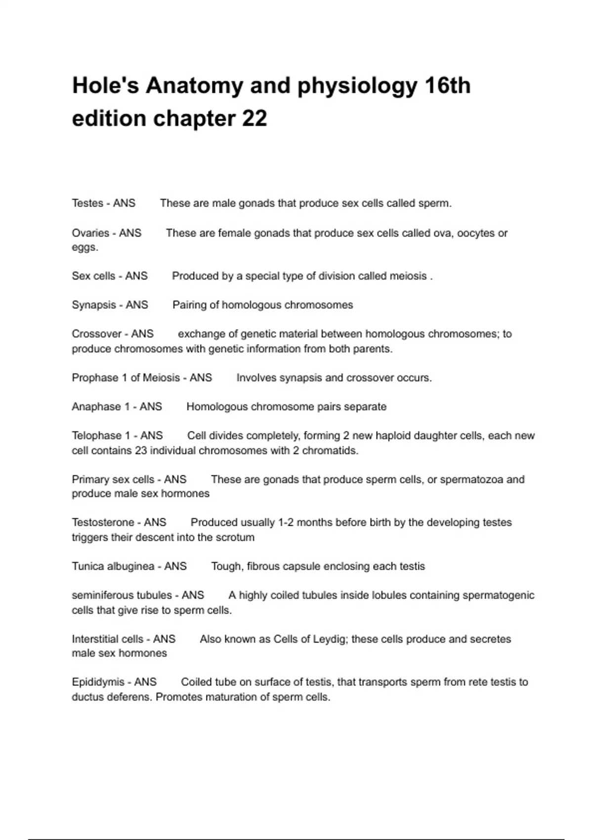 Testes - ANS These are male gonads that produce sex cells called sperm. Ovaries - ANS These are female gonads that produce sex cells called ova, oocytes or eggs. Sex cells - ANS Produced by a special type of division called meiosis . Synapsis - ANS Pairing of homologous chromosomes Crossover - ANS exchange of genetic material between homologous chromosomes; to produce chromosomes with genetic information from both parents. Prophase 1 of Meiosis - ANS Involves synapsis and crossover occurs. Anaphase 1 - ANS Homologous chromosome pairs separate Telophase 1 - ANS Cell divides completely, forming 2 new haploid daughter cells, each new cell contains 23 individual chromosomes with 2 chromatids. Primary sex cells - ANS These are gonads that produce sperm cells, or spermatozoa and produce male sex hormones Testosterone - ANS Produced usually 1-2 months before birth by the developing testes triggers their descent into the scrotum Tunica albuginea - ANS Tough, fibrous capsule enclosing each testis seminiferous tubules - ANS A highly coiled tubules inside lobules containing spermatogenic cells that give rise to sperm cells. Interstitial cells - ANS Also known as Cells of Leydig; these cells produce and secretes male sex hormones Epididymis - ANS Coiled tube on surface of testis, that transports sperm from rete testis to ductus deferens. Promotes maturation of sperm cells. Dutus (Vas) Deferens - ANS Each extends from the epididymis to the ejaculatory duct. Seminal vesicles - ANS Glands that secrete alkaline fluid which regulates pH in male and female tracts. Secreted fructose and prostaglandins. Contents empty into the ejaculatory duct, contributes most of volume of semen. Prostate gland - ANS Secrete a thin, milky alkaline fluid; secretion enhances sperm motility and contributes to volume of semen. bulbourethral glands - ANS Secreted mucus-like fluid into urethra, fluid released in response to sexual stimulation and lubricants end of penis. Semen - ANS Contains sperm plus various secretions of the accessory reproductive glands, sperm cells from the testes, contains secretion of the seminal vesicles, prostate gland, and bulbourethral glands and contains prostaglandins and nutrients. Scrotum - ANS Pouch of skin and subcutaneous tissue, located behind the penis. Dartos muscle - ANS Smooth muscle in subcutaneous tissue that contracts and relaxes in respon