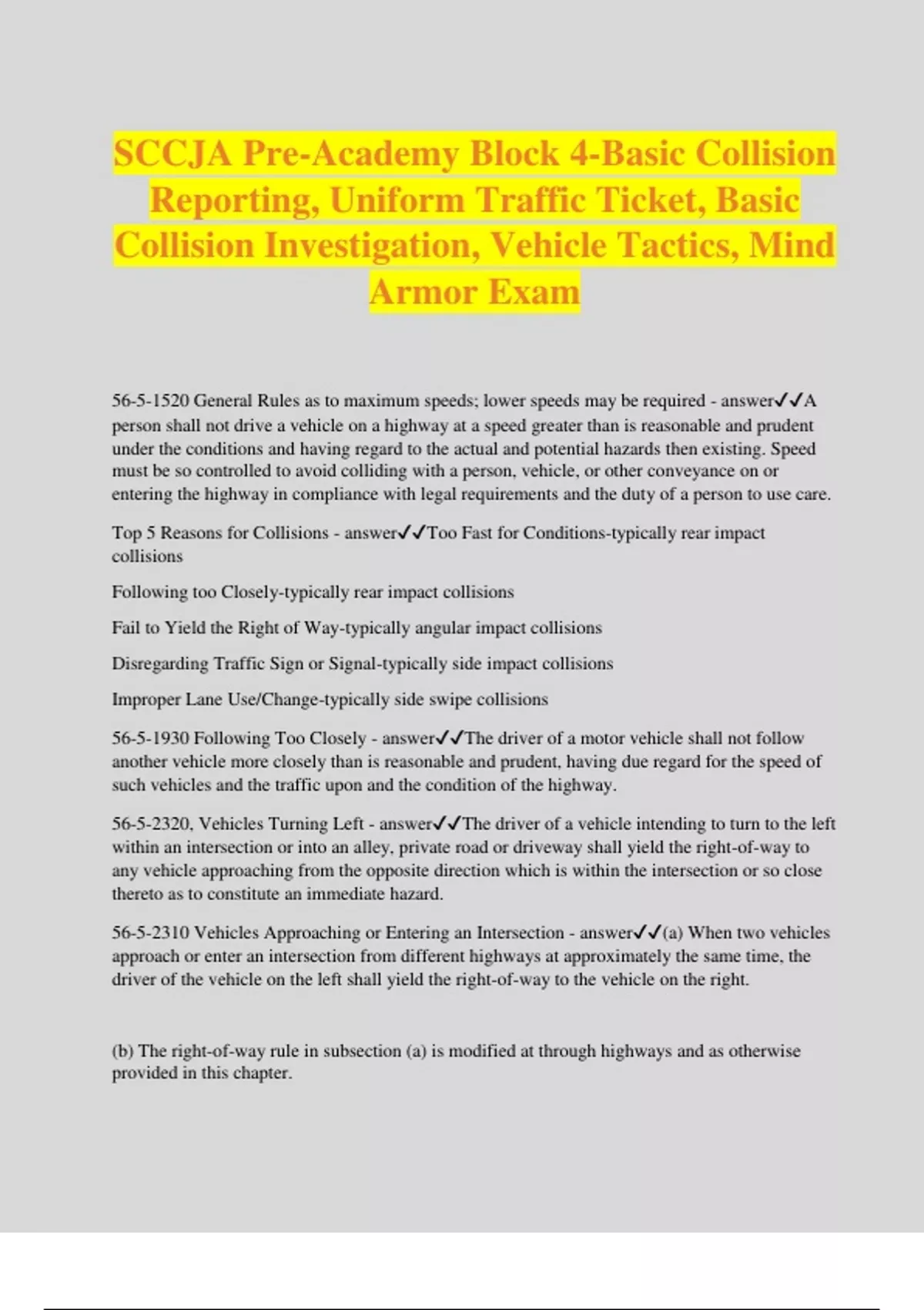 SCCJA Pre-Academy Block 4-Basic Collision Reporting, Uniform Traffic Ticket, Basic Collision Investigation, Vehicle Tactics, Mind Armor Exam