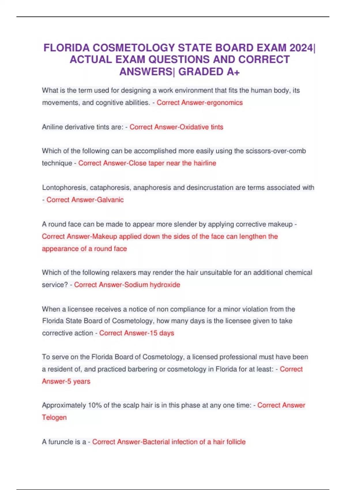FLORIDA COSMETOLOGY STATE BOARD EXAM 2024| ACTUAL EXAM QUESTIONS AND CORRECT ANSWERS| GRADED A+ What is the term used for designing a work environment that fits the human body, its movements, and cognitive abilities. - Correct Answer-ergonomics Aniline derivative tints are: - Correct Answer-Oxidative tints Which of the following can be accomplished more easily using the scissors-over-comb technique - Correct Answer-Close taper near the hairline Lontophoresis, cataphoresis, anaphoresis and desincrustation are terms associated with - Correct Answer-Galvanic A round face can be made to appear more slender by applying corrective makeup - Correct Answer-Makeup applied down the sides of the face can lengthen the appearance of a round face
