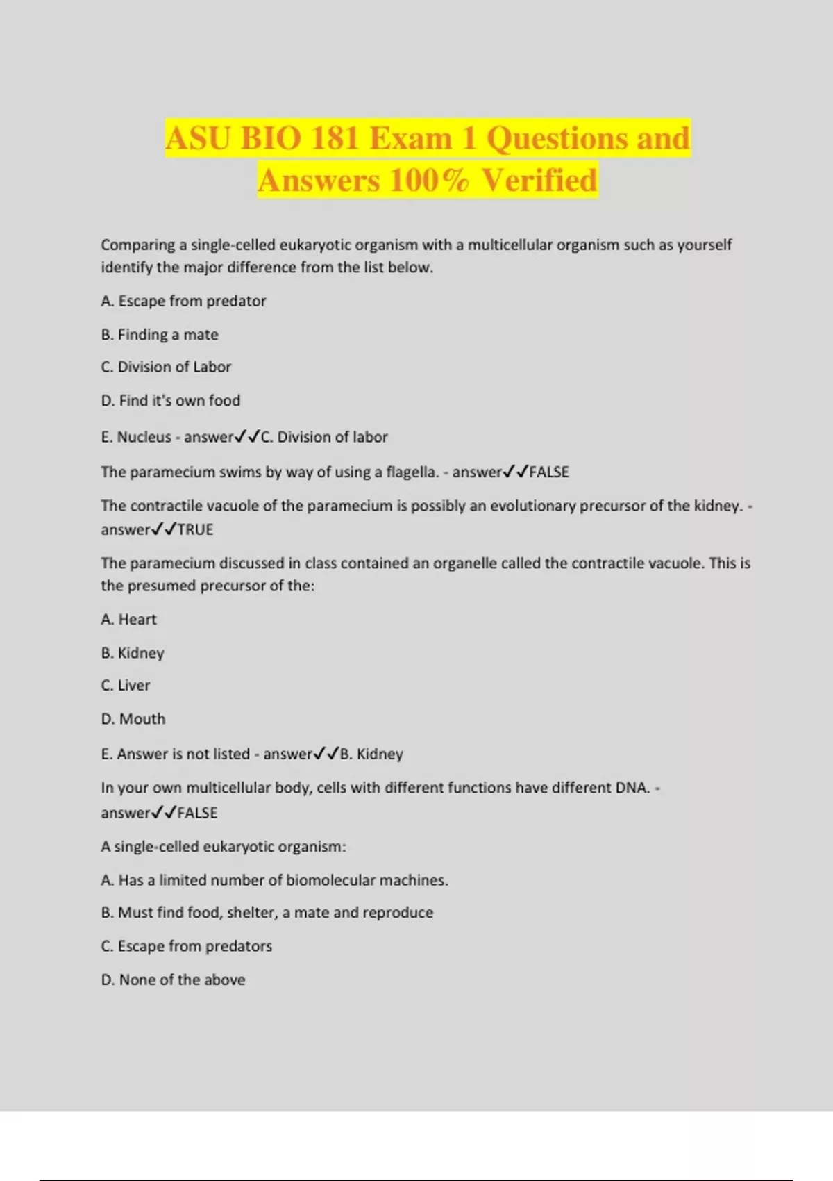 ASU BIO 181 Exam 1 Questions and Answers 100% Verified Comparing a single-celled eukaryotic organism with a multicellular organism such as yourself identify the major difference from the list below. A. Escape from predator B. Finding a mate C. Division of Labor D. Find it's own food E. Nucleus - answerC. Division of labor The paramecium swims by way of using a flagella. - answerFALSE The contractile vacuole of the paramecium is possibly an evolutionary precursor of the kidney. - answerTRUE The paramecium discussed in class contained an organelle called the contractile vacuole. This is the presumed precursor of the: A. Heart B. Kidney C. Liver D. Mouth E. Answer is not listed - answerB. Kidney In your own multicellular body, cells with different functions have different DNA. - answerFALSE A single-celled eukaryotic organism: A. Has a limited number of biomolecular machines. B. Must find food, shelter, a mate and reproduce C. Escape from predators D. None of the above E. Answers A,B,C - answerE. Answers A,B,C A cell that is anchorage-dependent for growth will also exhibit contact inhibition. - answerTRUE In your own multicellular body, different cells in your body have a division of labor between them. - answerTRUE Compared to bacteria which of the cell types below are not responsible for finding food" A. Lymphocyte B. Macrophage C. Fibroblast D. None of the above E. Answers a, b, and c - answerE. Answers A, B, C What limits the paramecium from acquiring more complex functions? - answerLimited number of biomolecular machines A normal cell is anchorage-dependent for growth and mortal. - answerTRUE In order to examine cells which are smaller than can be detected by the human senses what needs to be used? (pick the best answer). A. Patience B. Hypotheses C. Technology D. A cell trap E. None of the above - answerC. Technology In Cell Biology what can limit the progress of science? A. Lymphocyte B. Progress C. Eating D. Bacteria E. Technology - answerE. Technology A cancer cell will be anchorage-dependent for growth and immortal. - answerFALSE