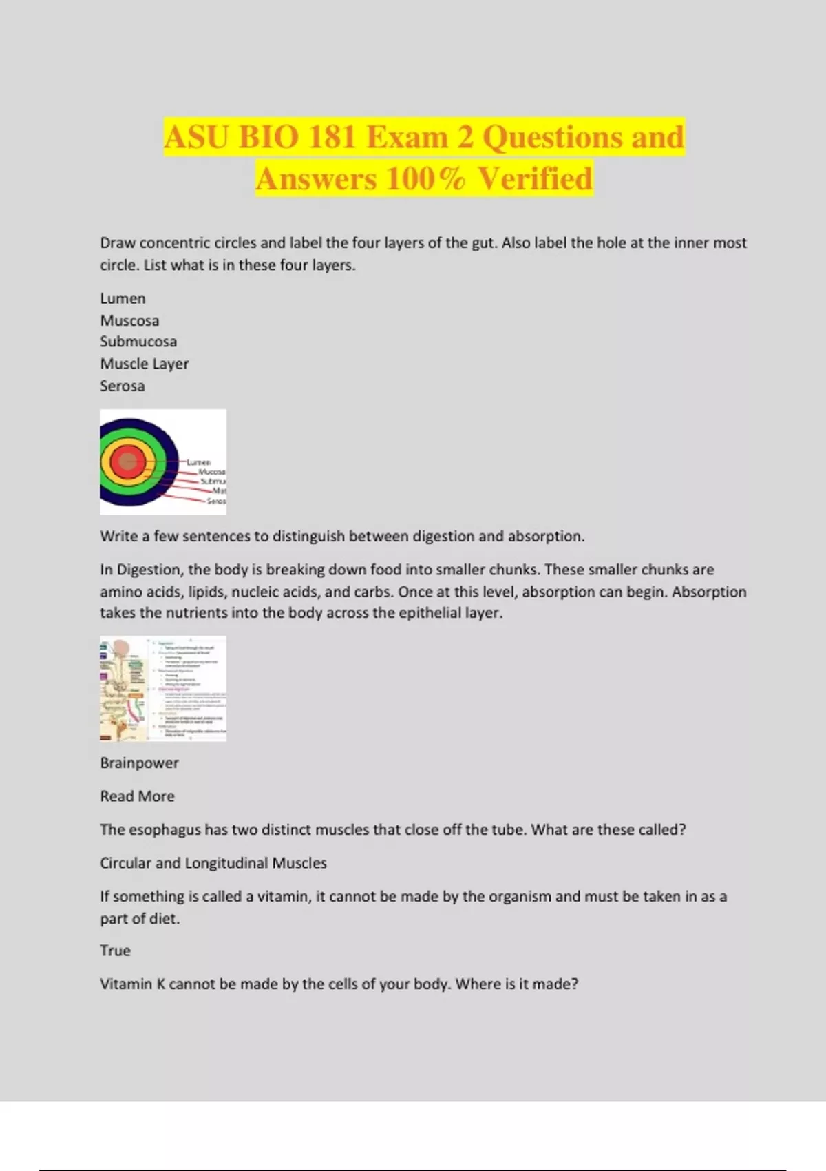 ASU BIO 181 Exam 2 Questions and Answers 100% Verified Draw concentric circles and label the four layers of the gut. Also label the hole at the inner most circle. List what is in these four layers. Lumen Muscosa Submucosa Muscle Layer Serosa Write a few sentences to distinguish between digestion and absorption. In Digestion, the body is breaking down food into smaller chunks. These smaller chunks are amino acids, lipids, nucleic acids, and carbs. Once at this level, absorption can begin. Absorption takes the nutrients into the body across the epithelial layer. Brainpower Read More The esophagus has two distinct muscles that close off the tube. What are these called? Circular and Longitudinal Muscles If something is called a vitamin, it cannot be made by the organism and must be taken in as a part of diet. True Vitamin K cannot be made by the cells of your body. Where is it made? Escherichia coli synthesizes vitamin k, which is then absorbed across the wall of the colon Name the main enzyme in the stomach. Pepsin Think about feedback loops. What triggers the gall bladder to secrete bile? The gallbladder is a small sack located under the rib cage on the right side of the abdomen that stores and releases bile. Based on a feedback loop, the gallbladder releases bile during a meal to help absorb fats by emulsifying the fat. A high-fat meal causes the release of more bile, and a low-fat meal causes less. In what way is the making of a primary lysosome similar to the enzymes delivered by the pancreas? Both are made by membrane bound polyribosomes 90% of absorption in the intestine occurs where? jejunum and illeum of the small intestine. When amino acids are acquired by food because your body can't make them they are called ___________________ ___________________ ___________________. essential amino acids The digestive track begins with the ___________________ and the first enzyme added is ___________________. mouth, amylase List the layers of the digestive tract covered by a thick layer of mucous. Only the cells of the mucosa have a thick layer of mucus When glucose is taken in by the digestive tract and enters your blood, cells are triggered to take in the glucose by what mechanism? Insulin and Insulin receptors List the order in which storage compounds are utilized if there is no intake of food. Glycogen and fat, then prote