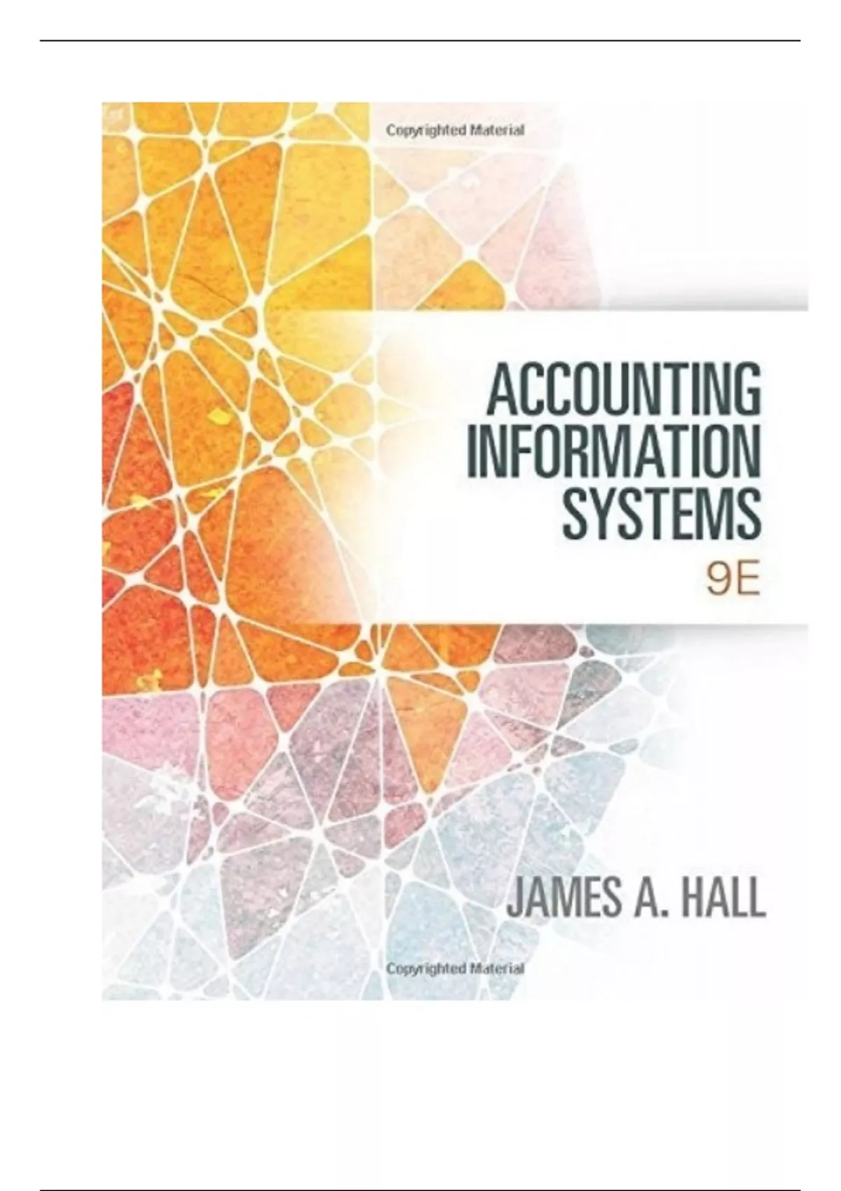 Accounting Information Systems Hall 9th Edition Test Bank Accounting Information Systems Hall 9th Edition Test Bank Chapter 1—The Information System: An Accountant’s Perspective TRUE/FALSE 1. Information is a business resource. ANS: T PTS: 1 2. IT outsourcing is location-independent computing. ANS: F PTS: 1 3. Transaction processing systems convert non-financial transactions into financial transactions. ANS: F PTS: 1 4. Information lacking reliability may still have value. ANS: F PTS: 1 5. A balance sheet prepared in conformity with GAAP is an example of discretionary reporting. ANS: F PTS: 1 6. The Management Reporting System provides the internal financial information needed to manage a business. ANS: T PTS: 1 7. Most of the inputs to the General Ledger System come from the Financial Reporting System. ANS: F PTS: 1 8. When preparing discretionary reports, organizations can choose what information to report and how to present it. ANS: T PTS: 1 9. Retrieval is the task of permanently removing obsolete or redundant records from the database. ANS: F PTS: 1 10. Systems development represents 80 to 90 percent of the total cost of a computer system. ANS: F PTS: 1 11. The database administrator is responsible for the security and integrity of the database. ANS: T PTS: 1 12. Custom software is completely finished, tested, and ready for implementation. ANS: F PTS: 1 13. The internal auditor represents the interests of third-party outsiders. ANS: F PTS: 1 14. Information Technology (IT) audits can be performed by both internal and external auditors. ANS: T PTS: 1 15. Custom software is the most affordable systems development option. ANS: F PTS: 1 16. A database is a collection of interconnected computers and communications devices that allows users to communicate, access data and applications, and share information and resources. ANS: F PTS: 1 17. Systems maintenance consumes the majority of a system’s total costs. ANS: T PTS: 1 18. Cloud computing is a practice in which the organization sells its IT resources to a third-party outsourcing vendor then leases back IT services from the vendor for a contract period. ANS: F PTS: 1 19. A potential benefit of cloud computing is that the client firm does not need to know where its data are bring processed. ANS: F PTS: 1 20. One of the greatest disadvantages of database systems is that all data is always available to all users. ANS: F PTS: 1 21. Under SOX legislation public accounting firms are no longer allowed to provide consulting services to audit clients. ANS: T PTS: 1 22. One member of a company’s audit committee must be an independent CPA. ANS: F PTS: 1 MULTIPLE CHOICE 1. Which of the following is not a business resource? a. raw material b. labor c. information d. all are business resources ANS: D PTS: 1 2. Which level of management is responsible for short-term planning and coordination of activities necessary to accomplish organizational objectives? a. operations management b. middle management c. top management d. line management ANS: B PTS: 1 3. Which level of management is responsible for controlling day-to-day operations? a. top management b. middle management c. operations management d. executive management ANS: C PTS: 1 4. Location-independent computing in which shared data centers deliver hosted IT services over the Internet. a. IT outsourcing b. Network administration c. Cloud computing d. Custom software ANS: C PTS: 1 5. The value of information for users is determined by all of the following but a. reliability b. relevance c. convenience d. completeness ANS: C PTS: 1 6. An example of a nonfinancial transaction is a. sale of products b. cash disbursement c. log of customer calls d. purchase of inventory ANS: C PTS: 1 7. An example of a financial transaction is a. the purchase of computer b. a supplier’s price list c. a delivery schedule d. an employee benefit brochure ANS: A PTS: 1 8. Which subsystem is not part of the Accounting Information System? a. Transaction Processing System b. Expert System c. General Ledger/Financial Reporting System d. Management Reporting System ANS: B PTS: 1 9. The major difference between the Financial Reporting System (FRS) and the Management Reporting System (MRS) is the a. FRS provides information to internal and external users; the MRS provides information to internal users b. FRS provides discretionary information; the MRS provides nondiscretionary information c. FRS reports are prepared using information provided by the General Ledger System; the MRS provides information to the General Ledger System d. FRS reports are prepared in flexible, nonstandardized formats; the MRS reports are prepared in standardized, formal formats ANS: A PTS: 1 10. The purpose of the Transaction Processing System includes all of the following except a. converting economic events into financial transactions b. recording financial transactions in the accounting records c. distributing essential information to operations personnel to support their daily operations d. measuring and reporting the status of financial resources and the changes in those resources ANS: D PTS: 1 11. The Transaction Processing System includes all of the following cycles except a. the revenue cycle b. the administrative cycle c. the expenditure cycle d. the conversion cycle ANS: B PTS: 1 12. The primary input to the Transaction Processing System is a. a financial transaction b. an accounting record c. an accounting report d. a nonfinancial transaction ANS: A PTS: 1 13. When designing the data collection activity, which type of data should be avoided? a. data that is relevant b. data that is efficient c. data that is redundant d. data that is accurate ANS: C PTS: 1 14. The most basic element of useful data in the database is a. the record b. the key c. the file d. the attribute ANS: D PTS: 1 15. In a database, a complete set of attributes for a single occurrence of an entity class is called a. a key b. a file c. a record d. a character ANS: C PT