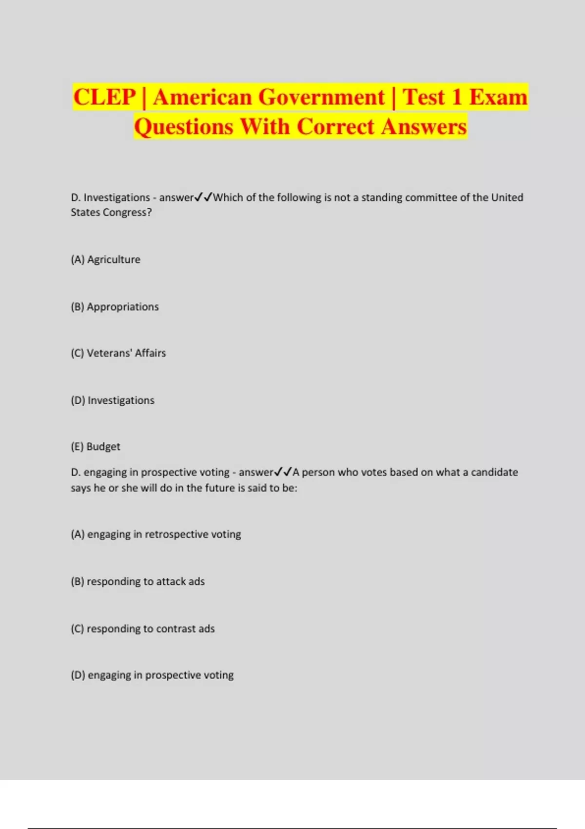 CLEP | American Government | Test 1 Exam Questions With Correct Answers D. Investigations - answerWhich of the following is not a standing committee of the United States Congress? (A) Agriculture (B) Appropriations (C) Veterans' Affairs (D) Investigations (E) Budget D. engaging in prospective voting - answerA person who votes based on what a candidate says he or she will do in the future is said to be: (A) engaging in retrospective voting (B) responding to attack ads (C) responding to contrast ads (D) engaging in prospective voting (E) responding to name recognition C. the House of Representatives - answerShould presidential candidates receive an equal number of electoral votes, the election is decided by: (A) the legislatures of Maine and Nebraska (B) a constitutional convention (C) the House of Representatives (D) the Senate (E) the Supreme Court B. Democracy - answer"A form of government in which the people are the ultimate political authority." These words best define what political arrangement? (A) Republicanism (B) Democracy (C) One person, one vote (D) Constitutional monarchy (E) Mobocracy C. direct democracy - answerNew England's town meetings are examples of: (A) a parliamentary system (B) oligarchy (C) direct democracy (D) democratic socialism (E) concurrence A. The Federalist Papers - answerUnder the pen name "Publius," Alexander Hamilton, James Madison, and John Jay wrote: (A) The Federalist Papers (B) The Anti-Federalist Papers (C) Common Sense (D) Leviathan (E) Second Treatise on Government A. nominated by the President and confirmed by the Senate. - answerFederal district court judges are: (A) nominated by the President and confirmed by the Senate. (B) nominated by the Chief Justice and confirmed by the Senate. (C) elected by standing judges of the same circuit. (D) nominated by a senator and confirmed by the entire Senate. (E) elected by the citizens of the district in which they will serve. A. the Mayflower Compact - answerIn the 17th Century, the signers of which of the following documents agreed to live under the colony's recognized authority and to wait for a royal charter, such has the Virginians had? (A) the Mayflower Compact (B) the Magna Carta (C) The Federalist (D) the English Bill of Rights (E) the Marshall Plan E. majoritarianism - answerA person who believes that the government should do what the majority of people in the country want to do is advocating (A) libertarianism (B) pluralist theory (C) popular sovereignty (D) elite theory (E) majoritarianism A. Secretary of State. - answerThe state officer typically responsible for overseeing federal elections at the state level is the: (A) Secretary of State. (B) Attorney General. (C) State Auditor. (D) Governor. (E) State Treasurer. B. choose the US president - answerThe purpose of the electoral college is to (A) decide in disputes between the executive and judiciary branches (B) choose the US president (C) break the tie votes in the Senate (D) promote higher education (E) regulate state election policies B. everyone should enjoy equal opportunities for personal and material success. - answerMost Americans believe that: