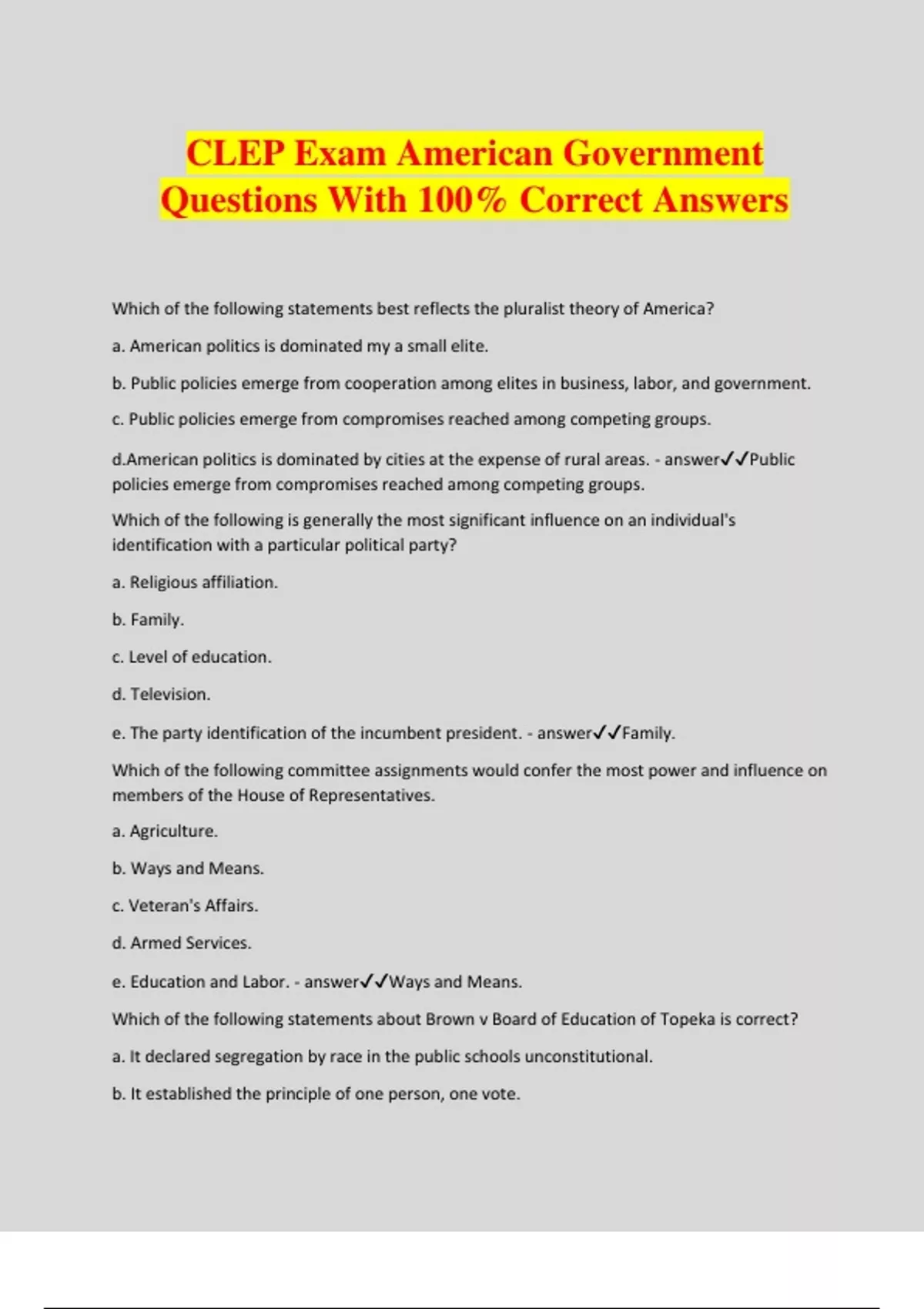 CLEP Exam American Government Questions With 100% Correct Answers Which of the following statements best reflects the pluralist theory of America? a. American politics is dominated my a small elite. b. Public policies emerge from cooperation among elites in business, labor, and government. c. Public policies emerge from compromises reached among competing groups. d.American politics is dominated by cities at the expense of rural areas. - answerPublic policies emerge from compromises reached among competing groups. Which of the following is generally the most significant influence on an individual's identification with a particular political party? a. Religious affiliation. b. Family. c. Level of education. d. Television. e. The party identification of the incumbent president. - answerFamily. Which of the following committee assignments would confer the most power and influence on members of the House of Representatives. a. Agriculture. b. Ways and Means. c. Veteran's Affairs. d. Armed Services. e. Education and Labor. - answerWays and Means. Which of the following statements about Brown v Board of Education of Topeka is correct? a. It declared segregation by race in the public schools unconstitutional. b. It established the principle of one person, one vote. c. It required that citizens about to be arrested be read a statement concerning their right to remain silent. d. It declared Bible reading in public schools unconstitutional. e. It declared segregation by race in places of public accommodation unconstitutional. - answerIt declared segregation by race in the public schools unconstitutional. Prior to the Voting Rights Act of 1965, literacy tests were used by some southern states to: - answerPrevent African Americans from exercising their right to vote. The practice whereby individual senators can veto federal judicial nominations in their respective states is called: - answerSenatorial Courtesy. Differences between House and Senate versions of a bill are resolved: - answerIn a conference committee. Which of the following principles protects a citizen from imprisonment without trial? a. Representative government. b. Separation of powers. c. Due process. d. Checks and balances. e. Popular sovereignty. - answerDue process. The passage of legislation in Congress often depends on mutual accomodations among members. This suggests that, to some extent, congressional behavior is based on: - answerThe principle of reciprocity. Which of the following statements accurately describes the president's veto power? a. A president sometimes threatens to veto a bill that is under discussion in order to influence congressional decision making. b. A president typically vetoes about a third of the bills passed by Congress. c. Congress is usually unable to override a president's veto. - answerA president sometimes threatens to veto a bill that is under discussion in order to influence congressional decision makin. Congress is usually unable to override a president's veto. All of the following issues were decided at the Constitutional Convention of 1787 EXCEPT: a. Representation in the legislature. b. Voting qualifications of the electorate. c. The method of electing the president. d. Congressional power to override a presidential veto. d. Qualifications for members of the house and Senate. - answerVoting qualifications of the electorate. The principle of stare decisis refers to which of the following? a. The process in which groups write leal briefs to influence the outcome of a case. b. The process by which Supreme Court justices decide which cases to hear. c. The process by which judges interpret common law principles along with constitutional law. d. The judicial principle of following precedents that were established in previous court decisions. e. A legal principle that allows parties to settle their disputes outside the courtroom. - answerThe judicial principle of following precedents that were established in previous court decisions. The usefulness to the president of having cabinet members as political advisors is undermined by the fact that: - answerThe loyalties of cabinet members are often divided between loyalty to the president or loyalty to their own executive departments. All of the following are constitutional rights that neither the federal government nor the states can restrict EXCEPT the right to: a. Remain silent during questioning. b. Be represented by counsel. c. Be indicted by grand jury. d. Not be tried for the same offense twice. e. Receive a trial by jury in a criminal case. - answerBe indicted by grand jury. In the electoral history o the United States, third parties have been effective vehicles of protest when they: - answerDramatized issues and positions that were being ignored by the major parties. Which of the following best defines the term "judicial activism"? a. The tendency of judges to hear large numbers of cases on social issues. b. The efforts of judges to lobby Congress for funds.