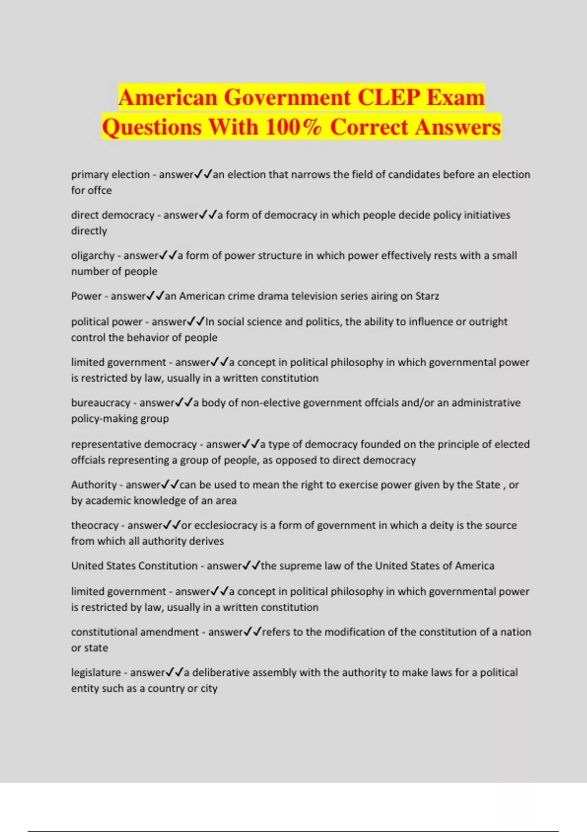 American Government CLEP Exam Questions With 100% Correct Answers primary election - answeran election that narrows the field of candidates before an election for offce direct democracy - answera form of democracy in which people decide policy initiatives directly oligarchy - answera form of power structure in which power effectively rests with a small number of people Power - answeran American crime drama television series airing on Starz political power - answerIn social science and politics, the ability to influence or outright control the behavior of people limited government - answera concept in political philosophy in which governmental power is restricted by law, usually in a written constitution bureaucracy - answera body of non-elective government offcials and/or an administrative policy-making group representative democracy - answera type of democracy founded on the principle of elected offcials representing a group of people, as opposed to direct democracy Authority - answercan be used to mean the right to exercise power given by the State , or by academic knowledge of an area theocracy - answeror ecclesiocracy is a form of government in which a deity is the source from which all authority derives United States Constitution - answerthe supreme law of the United States of America limited government - answera concept in political philosophy in which governmental power is restricted by law, usually in a written constitution constitutional amendment - answerrefers to the modification of the constitution of a nation or state legislature - answera deliberative assembly with the authority to make laws for a political entity such as a country or city Bill of Rights - answerthe collective name for the first ten amendments to the United States Constitution nullification - answerin United States constitutional history, is a legal theory that a state has the right to nullify, or invalidate, any federal law which that state has deemed unconstitutional Great Depression - answera severe worldwide economic depression that took place during the 1930s bicameral - answerA bicameral legislature is one in which the legislators are divided into two separate assemblies, chambers or houses judicial branch - answerthe system of courts that interprets and applies the law in the name of the state sovereign nation - answeris understood in jurisprudence as the full right and power of a governing body to govern itself without any interference from outside sources or bodies legislative branch - answera deliberative assembly with the authority to make laws for a political entity such as a country or city Fourteenth Amendment - answerwas adopted on July 9, 1868, as one of the Reconstruction Amendments New Deal - answerwas a series of social liberal programs enacted in the United States between 1933 and 1938, and a few that came later state official - answersomeone who holds an office in an organization or government and participates in the exercise of authority Interest groups - answerAdvocacy groups use various forms of advocacy in order to influence public opinion and/or policy Issue networks - answeran alliance of various interest groups and individuals who unite in order to promote a single issue in government policy bureaucracy - answera body of non-elective government officials and/or an administrative policy-making group New Deal - answera series of social liberal programs enacted in the United States between 1933 and 1938, and a few that came later Conflict - answerIn literature, the literary element is an inherent incompatibility between the objectives of two or more characters or forces