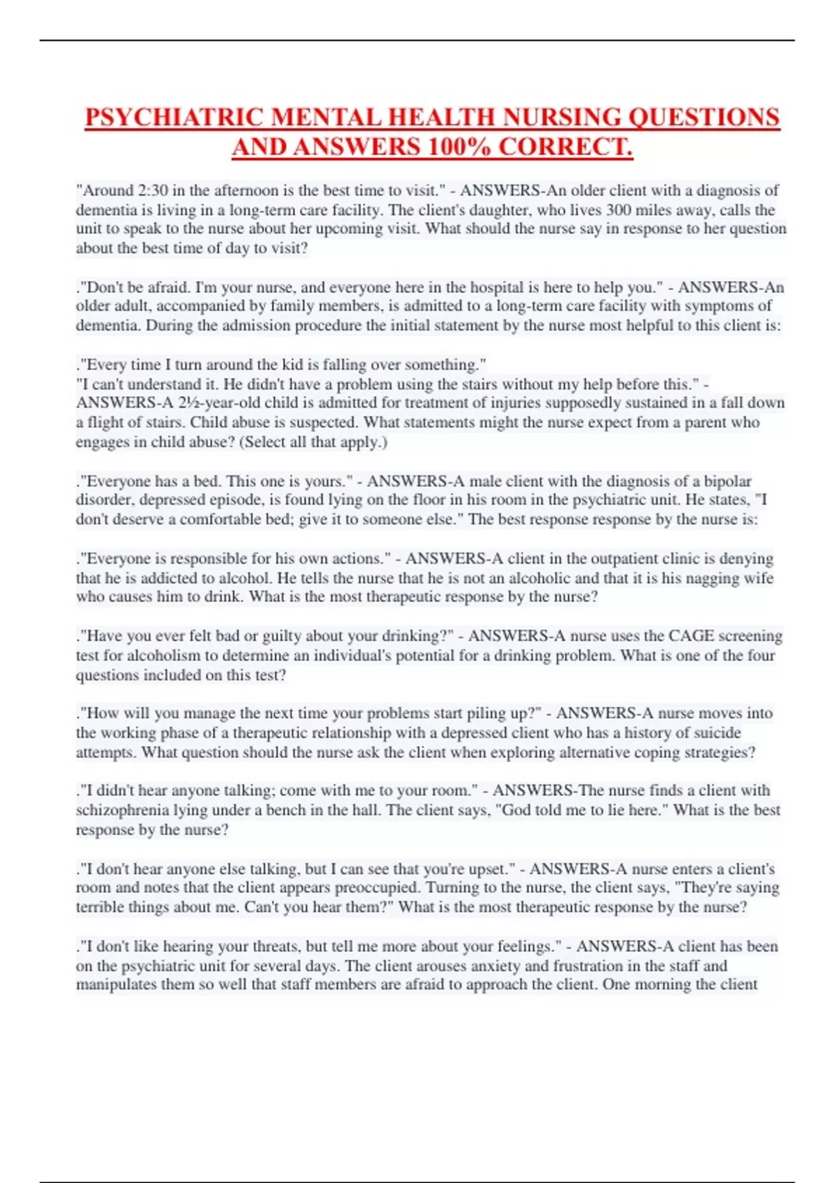 PSYCHIATRIC MENTAL HEALTH NURSING QUESTIONS AND ANSWERS 100% CORRECT.