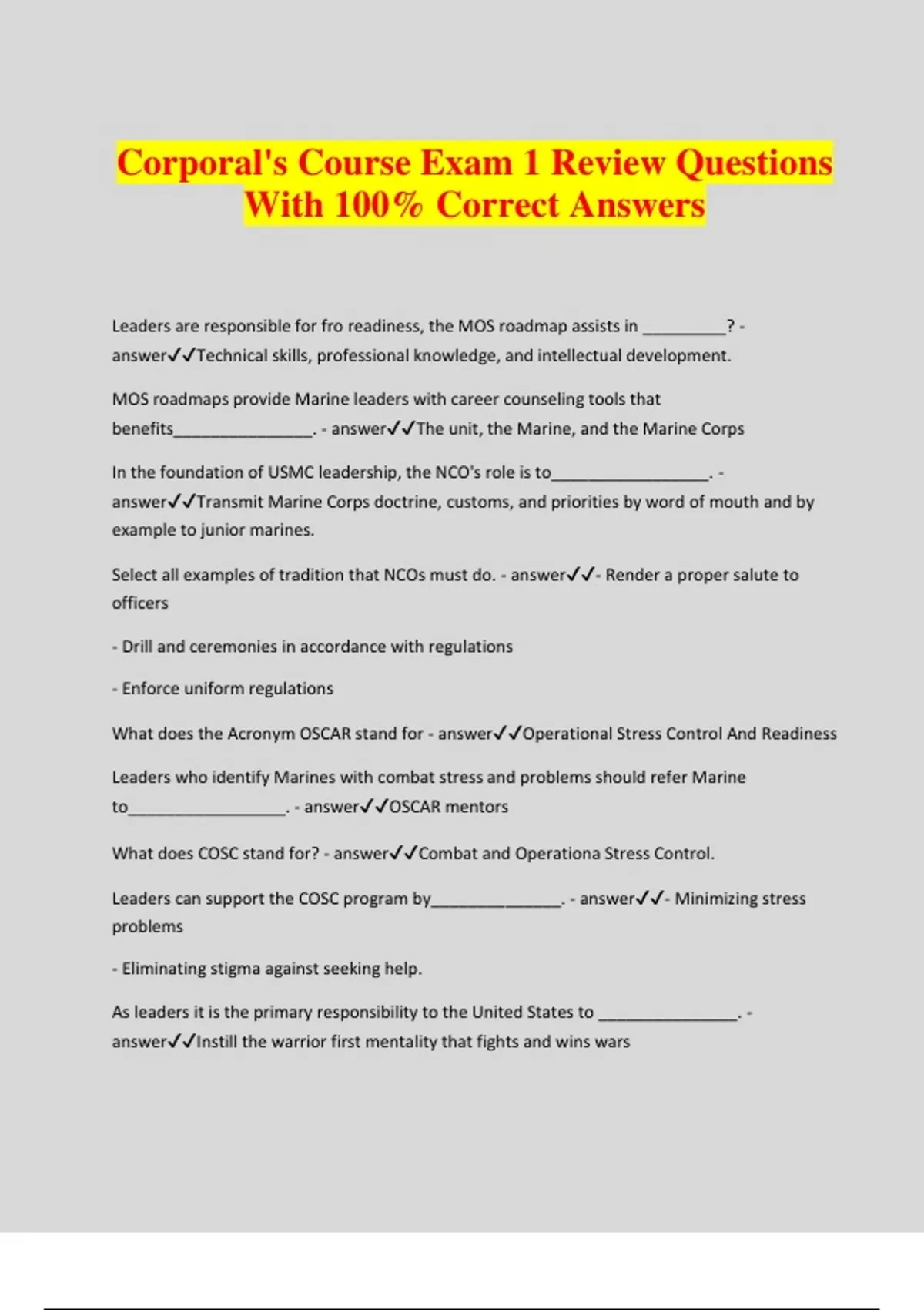 Corporal's Course Exam 1 Review Questions With 100% Correct Answers Leaders are responsible for fro readiness, the MOS roadmap assists in _________? - answerTechnical skills, professional knowledge, and intellectual development. MOS roadmaps provide Marine leaders with career counseling tools that benefits_______________. - answerThe unit, the Marine, and the Marine Corps In the foundation of USMC leadership, the NCO's role is to_________________. - answerTransmit Marine Corps doctrine, customs, and priorities by word of mouth and by example to junior marines. Select all examples of tradition that NCOs must do. - answer- Render a proper salute to officers - Drill and ceremonies in accordance with regulations - Enforce uniform regulations What does the Acronym OSCAR stand for - answerOperational Stress Control And Readiness Leaders who identify Marines with combat stress and problems should refer Marine to_________________. - answerOSCAR mentors What does COSC stand for? - answerCombat and Operationa Stress Control. Leaders can support the COSC program by______________. - answer- Minimizing stress problems - Eliminating stigma against seeking help. As leaders it is the primary responsibility to the United States to _______________. - answerInstill the warrior first mentality that fights and wins wars