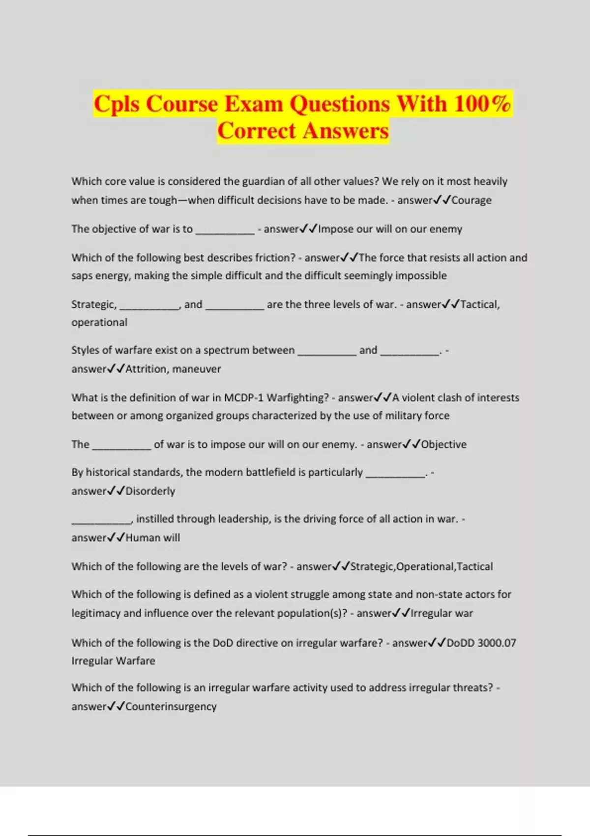 Cpls Course Exam Questions With 100% Correct Answers Which core value is considered the guardian of all other values? We rely on it most heavily when times are tough—when difficult decisions have to be made. - answerCourage The objective of war is to __________ - answerImpose our will on our enemy Which of the following best describes friction? - answerThe force that resists all action and saps energy, making the simple difficult and the difficult seemingly impossible Strategic, __________, and __________ are the three levels of war. - answerTactical, operational Styles of warfare exist on a spectrum between __________ and __________. - answerAttrition, maneuver What is the definition of war in MCDP-1 Warfighting? - answerA violent clash of interests between or among organized groups characterized by the use of military force The __________ of war is to impose our will on our enemy. - answerObjective By historical standards, the modern battlefield is particularly __________. - answerDisorderly __________, instilled through leadership, is the driving force of all action in war. - answerHuman will Which of the following are the levels of war? - answerStrategic,Operational,Tactical Which of the following is defined as a violent struggle among state and non-state actors for legitimacy and influence over the relevant population(s)? - answerIrregular war Which of the following is the DoD directive on irregular warfare? - answerDoDD 3000.07 Irregular Warfare Which of the following is an irregular warfare activity used to address irregular threats? - answerCounterinsurgency