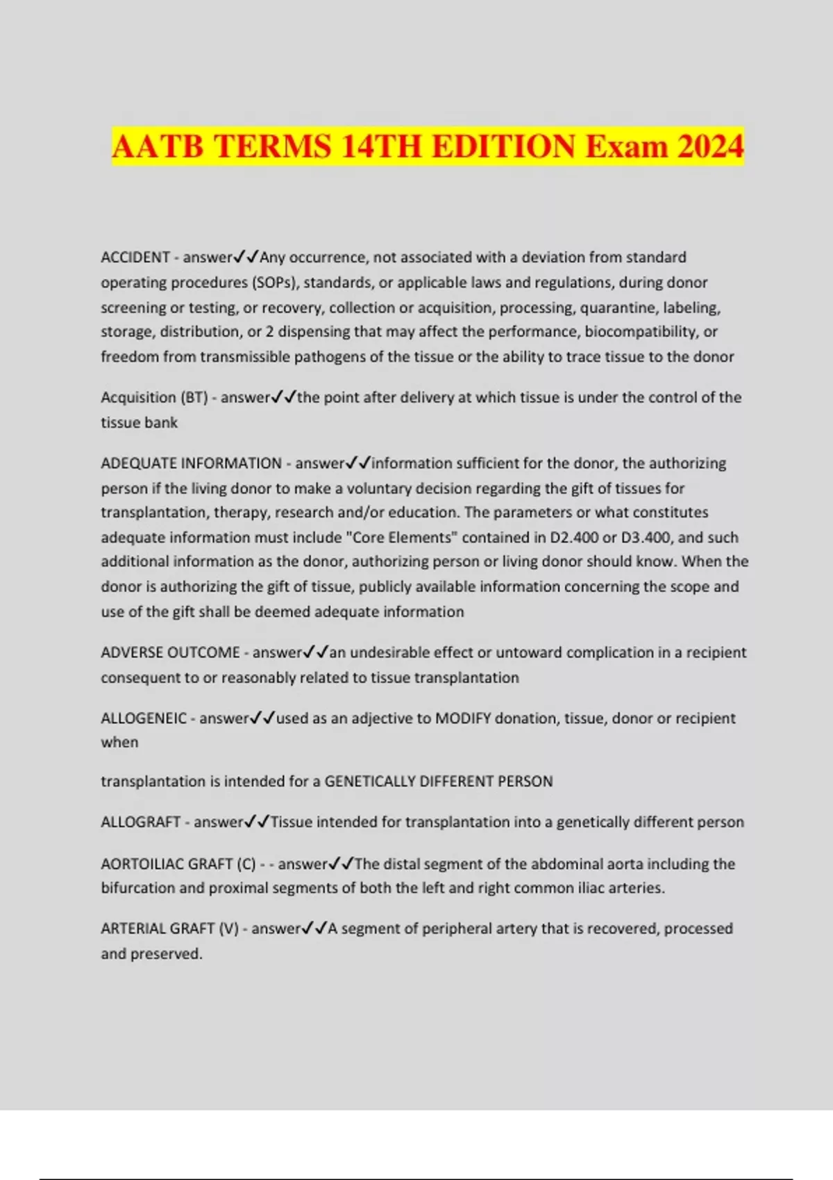 AATB TERMS 14TH EDITION Exam 2024 ACCIDENT - answerAny occurrence, not associated with a deviation from standard operating procedures (SOPs), standards, or applicable laws and regulations, during donor screening or testing, or recovery, collection or acquisition, processing, quarantine, labeling, storage, distribution, or 2 dispensing that may affect the performance, biocompatibility, or freedom from transmissible pathogens of the tissue or the ability to trace tissue to the donor Acquisition (BT) - answerthe point after delivery at which tissue is under the control of the tissue bank ADEQUATE INFORMATION - answerinformation sufficient for the donor, the authorizing person if the living donor to make a voluntary decision regarding the gift of tissues for transplantation, therapy, research and/or education. The parameters or what constitutes adequate information must include "Core Elements" contained in D2.400 or D3.400, and such additional information as the donor, authorizing person or living donor should know. When the donor is authorizing the gift of tissue, publicly available information concerning the scope and use of the gift shall be deemed adequate information ADVERSE OUTCOME - answeran undesirable effect or untoward complication in a recipient consequent to or reasonably related to tissue transplantation ALLOGENEIC - answerused as an adjective to MODIFY donation, tissue, donor or recipient when transplantation is intended for a GENETICALLY DIFFERENT PERSON ALLOGRAFT - answerTissue intended for transplantation into a genetically different person AORTOILIAC GRAFT (C) - - answerThe distal segment of the abdominal aorta including the bifurcation and proximal segments of both the left and right common iliac arteries. ARTERIAL GRAFT (V) - answerA segment of peripheral artery that is recovered, processed and preserved. ASEPTIC PROCESSING - answerThe processing of tissue using the aseptic techniques where tissue, containers and/or devices are handled in a controlled environment in which the air supply, materials, equipment and personnel are regulated to prevent microbial contamination of tissue ASEPTIC RECOVERY - answerThe recovery of tissue using methods that restrict or minimize contamination with microorganisms from the donor, environment, recovery personnel, and/or equipment ASYSTOLE - answerThe reference time for cardiac death. A documented pronounced time of death is used as asystole when life-saving procedures have been attempted and there were signs of, or documentation of, recent life (e.g., witnessed event, agonal respirations, pulseless electrical activity). If a death was not witnessed, asystole must be determined by the last time known alive. Asystole will be 'cross clamp time' if the tissue donor was also a solid organ donor AUDIT - answerA documented review of procedures, records, personnel functions, equipment, materials, facilities, and/or suppliers to evaluate adherence to the written SOPM, standards, applicable laws and regulations. AUDIT TRAIL - answera process that captures details such as additions, deletions, or alterations of information in an electronic record without obliterating the original record. An audit trail facilitates the reconstruction of the course of such details relating to the electronic record. (FDA Guidance for Industry, Computerized Systems Used in Clinical Investigations, May 2007) AUTHORIZATION - answerPermission given after Adequate Information concerning the donation, recovery and use of tissues is conveyed. AUTHORIZING PERSON - answerUpon the death of the Donor, the person, other than the Donor, authorized by law to make an anatomical gift.