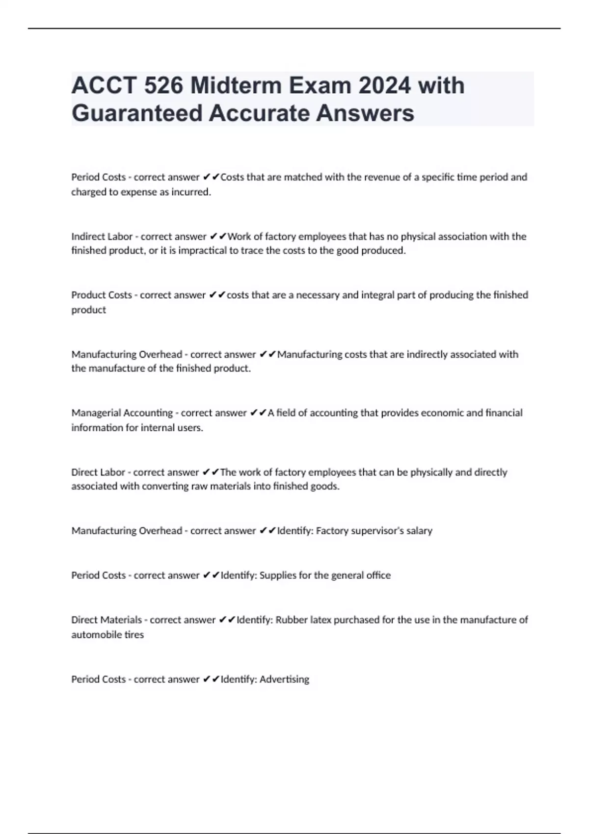 Period Costs - correct answer Costs that are matched with the revenue of a specific time period and charged to expense as incurred. Indirect Labor - correct answer Work of factory employees that has no physical association with the finished product, or it is impractical to trace the costs to the good produced. Product Costs - correct answer costs that are a necessary and integral part of producing the finished product Manufacturing Overhead - correct answer Manufacturing costs that are indirectly associated with the manufacture of the finished product. Managerial Accounting - correct answer A field of accounting that provides economic and financial information for internal users. Direct Labor - correct answer The work of factory employees that can be physically and directly associated with converting raw materials into finished goods. Manufacturing Overhead - correct answer Identify: Factory supervisor's salary Period Costs - correct answer Identify: Supplies for the general office Direct Materials - correct answer Identify: Rubber latex purchased for the use in the manufacture of automobile tires Period Costs - correct answer Identify: Advertising Manufacturing Overhead - correct answer Identify: Rent on factory equipment Period Costs - correct answer Identify: Utility cost for the store Period Costs - correct answer Identify: Salary paid to the company's chief executive officer Manufacturing Overhead - correct answer Identify: Salary paid to mechanics who maintain and repair factory equipment Direct Labor - correct answer Identify: Wages paid to assembly-line workers who install interiors in automobiles a. deal with the economic events of an enterprise - correct answer Financial and managerial accounting are similar in that both: a. deal with the economic events of an enterprise. b. produce general-purpose reports. c. have the same primary users. d. have reports that are prepared quarterly and annually. c. the product is sold - correct answer Product costs are expenses on the income statement when: a. the product completes the manufacturing process. b. the order is received for the product. c. the product is sold. d. raw materials for the product are purchased. a. $22,500 15,500 + 44,500 - 37,500 = - correct answer Super Tread Inc. is a large manufacturer of auto tires. Super Tread has provided the following information: Sales Revenue $55,000 Beginning Finished Goods Inventory $15,500 Cost of Goods sold $37,500 Cost of Goods Manufactured $44,500 Calculate the amount of ending Finished Goods Inventory reported on Super Tread's balance sheet. c. $1,135,000 Direct Materials (81,000+360,000-59,000) + Direct Labor (471,000) + Factory Overhead (19,000+24,000+268,000) + Work-in-Process (26,000-55,000) - correct answer Payton Corporation provided the following information for the year: Beginning Balance - Work-in-Process Inventory $26,000 Ending Balance - Work-in-Process Inventory $55,000 Beginning Balance - Direct Materials 81,000 Ending Balance - Direct Materials 59,000 Purchases - Direct Materials 360,000 Direct Labor 471,000 Indirect Labor 19,000 Depreciation on Factory Plant and Equipment 24,000 Plan