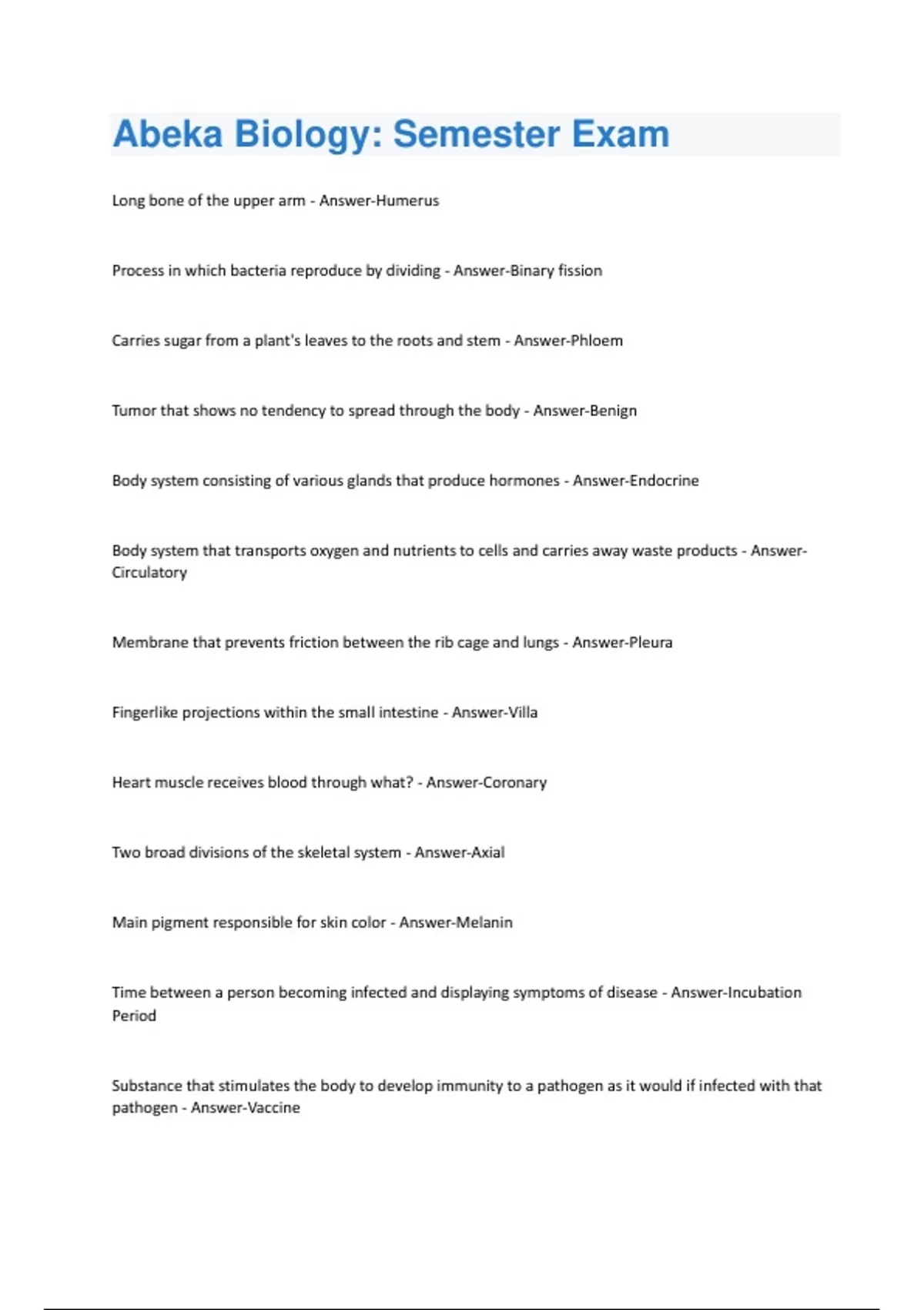 Long bone of the upper arm - Answer-Humerus Process in which bacteria reproduce by dividing - Answer-Binary fission Carries sugar from a plant's leaves to the roots and stem - Answer-Phloem Tumor that shows no tendency to spread through the body - Answer-Benign Body system consisting of various glands that produce hormones - Answer-Endocrine Body system that transports oxygen and nutrients to cells and carries away waste products - AnswerCirculatory Membrane that prevents friction between the rib cage and lungs - Answer-Pleura Fingerlike projections within the small intestine - Answer-Villa Heart muscle receives blood through what? - Answer-Coronary Two broad divisions of the skeletal system - Answer-Axial Main pigment responsible for skin color - Answer-Melanin Time between a person becoming infected and displaying symptoms of disease - Answer-Incubation Period Substance that stimulates the body to develop immunity to a pathogen as it would if infected with that pathogen - Answer-VaccineStigma, style and ovary make up the flowers what - Answer-Pistol Starch and dietary fiber are made from long chains of smaller molecules called - AnswerMonosaccharides Hormone produced by the thyroid gland to regulate body metabolism - Answer-Thyroxin Green plants use a light driven process called what to manufacture glucose from water and carbon dioxide - Answer-Photosynthesis Oil that waterproofs the skin and keeps it soft and flexible - Answer-Sebum Tiny air sacs in the lungs that allow gases to be exchanged between the air and the blood - AnswerAlveoli Main reproductive organs are the gonads which are the testes in women - Answer-Ovaries The concept that every infectious disease is cause by a specific germ - Answer-Germ concept Club-shaped spore-bearing structure produced by certain fungi - Answer-Basidia Ingested food is stored and mixed with gastric juice in what? - Answer-Stomach Liquid portion of the blood - Answer-Plasma Light sensitive layer of the eye that converts light rays into nerve impulses and transmits them to the brain - Answer-RetinaNonflowering plants that reproduce by seeds not covered by the walls of an ovary - AnswerGymnosperm Portion of a root that absorbs water and minerals from the soil - Answer-Root hairs Bulged end of a long bone - Answer-Epiphysis Central nervous system consists of the brain and what - Answer-Spinal cord Structures if the skin that helps regulate body temperature - Answer-Sweat glands Rounded head of a bone fits into an indention on another bone - Answer-Ball and socket Hormones, insulin, and glucagon regulate the level of what in the blood - Answer-Glucose Portion of a plant embryo that stored good for germination - Answer-Cotyledon Part of the brain primarily responsible for thought, memory, and consciousness. - Answer-Cerebrum Occurs when the immune system attacks the body - Answer-Autoimmune system Individual contracting units of a skeletal muscle cell - Answer-Sarcomeres Caused by a lack of an essential nutrient - Answer-Deficiency