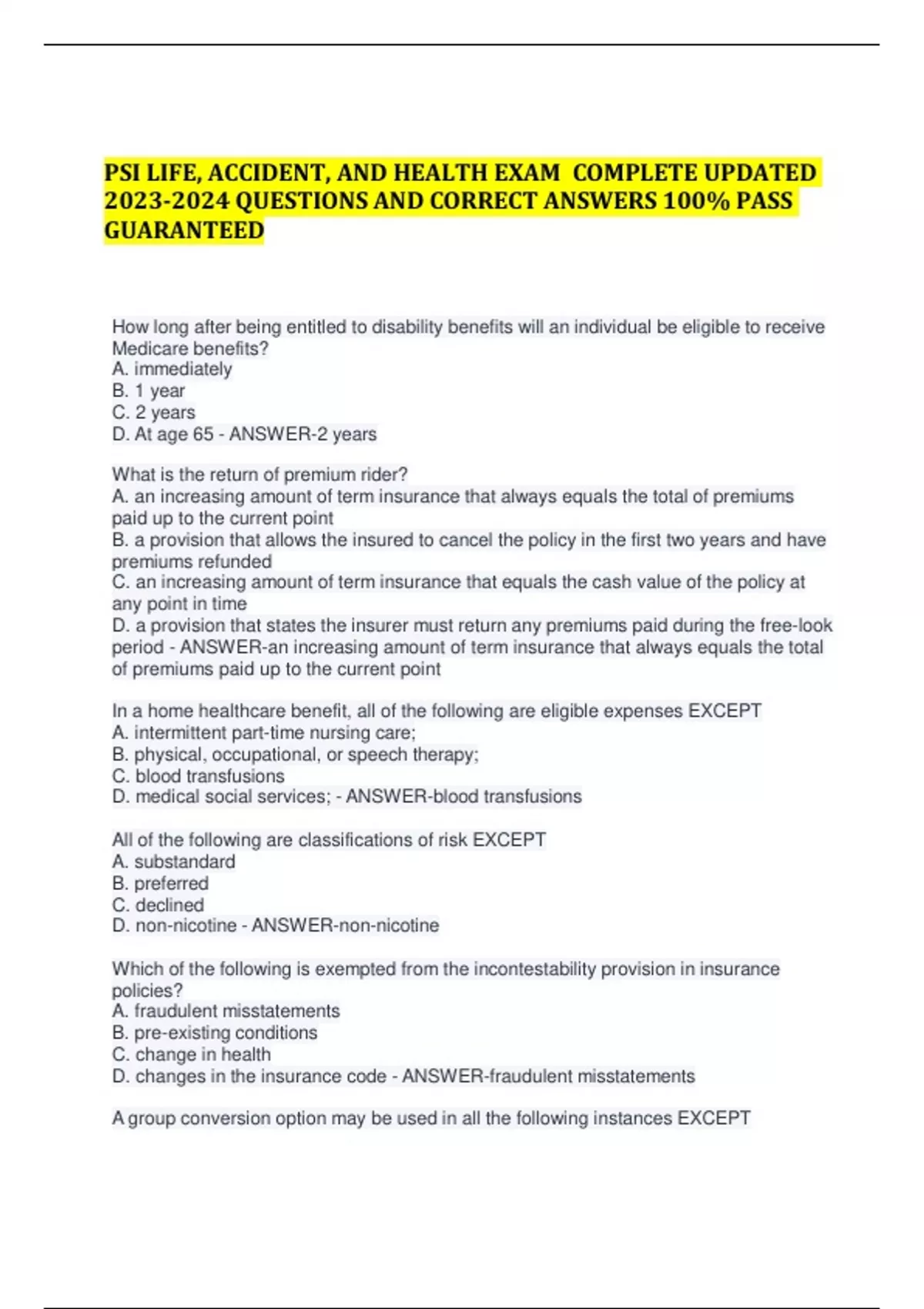 PSI LIFE, ACCIDENT, AND HEALTH EXAM COMPLETE UPDATED QUESTIONS AND CORRECT ANSWERS 100% PASS GUARANTEED