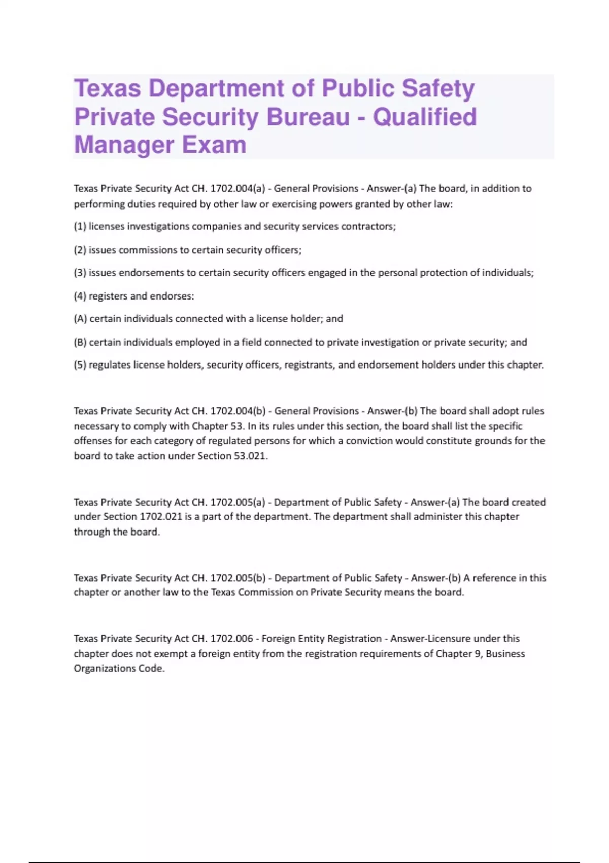 Texas Department of Public Safety Private Security Bureau - Qualified Manager Exam All Possible Questions and Answers with complete solution