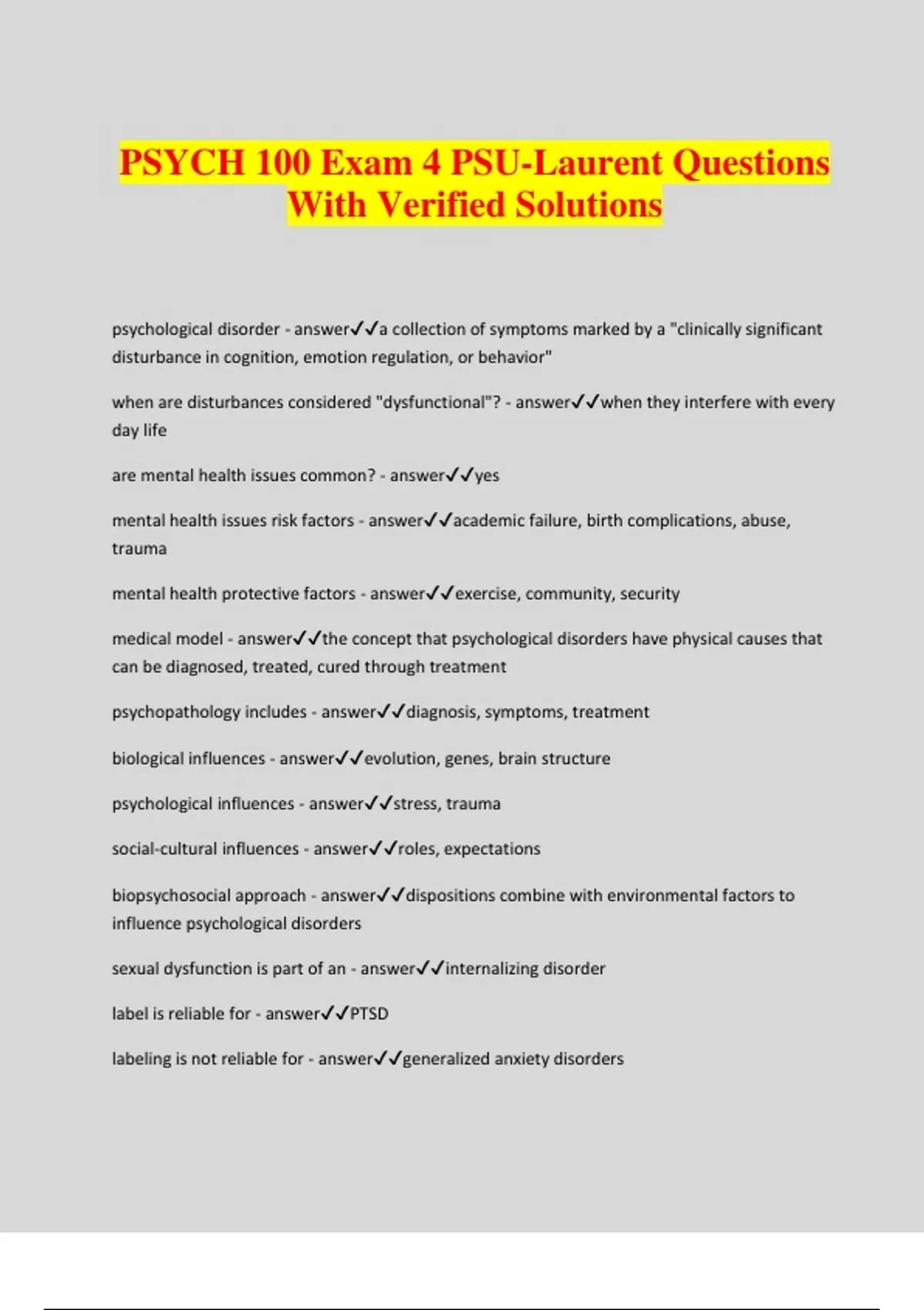 PSYCH 100 Exam 4 PSU-Laurent Questions With Verified Solutions psychological disorder - answera collection of symptoms marked by a "clinically significant disturbance in cognition, emotion regulation, or behavior" when are disturbances considered "dysfunctional"? - answerwhen they interfere with every day life are mental health issues common? - answeryes mental health issues risk factors - answeracademic failure, birth complications, abuse, trauma mental health protective factors - answerexercise, community, security medical model - answerthe concept that psychological disorders have physical causes that can be diagnosed, treated, cured through treatment psychopathology includes - answerdiagnosis, symptoms, treatment biological influences - answerevolution, genes, brain structure psychological influences - answerstress, trauma social-cultural influences - answerroles, expectations biopsychosocial approach - answerdispositions combine with environmental factors to influence psychological disorders sexual dysfunction is part of an - answerinternalizing disorder label is reliable for - answerPTSD labeling is not reliable for - answergeneralized anxiety disorders