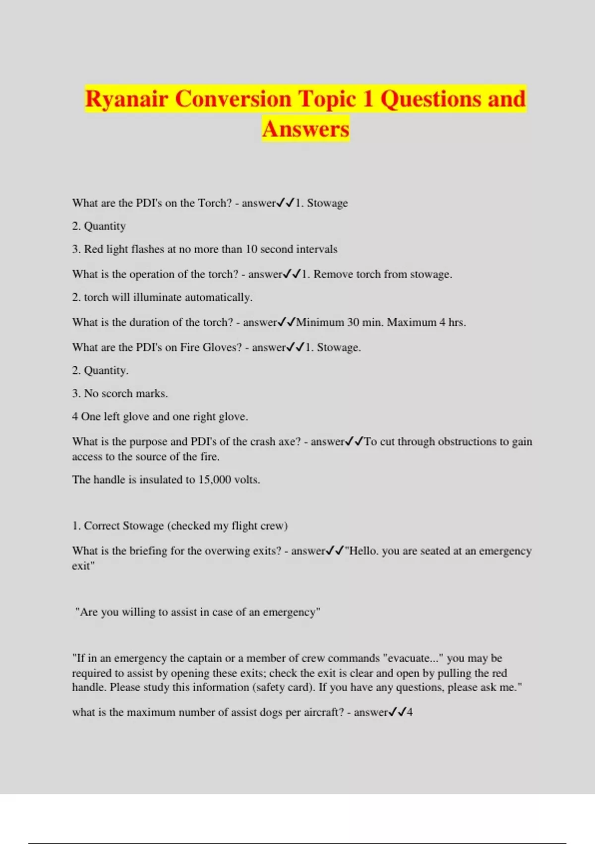 Ryanair Conversion Topic 1 Questions and Answers What are the PDI's on the Torch? - answer1. Stowage 2. Quantity 3. Red light flashes at no more than 10 second intervals What is the operation of the torch? - answer1. Remove torch from stowage. 2. torch will illuminate automatically. What is the duration of the torch? - answerMinimum 30 min. Maximum 4 hrs. What are the PDI's on Fire Gloves? - answer1. Stowage. 2. Quantity. 3. No scorch marks. 4 One left glove and one right glove. What is the purpose and PDI's of the crash axe? - answerTo cut through obstructions to gain access to the source of the fire. The handle is insulated to 15,000 volts. 1. Correct Stowage (checked my flight crew) What is the briefing for the overwing exits? - answer"Hello. you are seated at an emergency exit" "Are you willing to assist in case of an emergency" "If in an emergency the captain or a member of crew commands "evacuate..." you may be required to assist by opening these exits; check the exit is clear and open by pulling the red handle. Please study this information (safety card). If you have any questions, please ask me." what is the maximum number of assist dogs per aircraft? - answer4 How many exits does a Boeing 737-800 series aircraft have? - answer8 Where are the overwing escape ropes located? - answerrow 17 How do we open Overwing Emergency Exits from Inside? - answer1. Pull handle down and inwards. 2. Exits opens out and upwards automatically. What PDIs do we carry out on Overwing Emergency Exits? - answerClear perspex cover over the handle. What is a Safety Strap? - answerThis is a visible barrier that extends across the open doorway We always treat all Slides as manual, what does this mean? - answerAfter the slide has infalted CC must always pull manual inflation handle to ensure that slide has inflated correctly. What is the correct evacuation command when using an Apron Slide? - answer"sit and slide" CC arrive to a closed aircraft before the flight crew and the airbridge is connected to the L1 door. How can they access the aircraft? - answer1. Pull the handle out. 2. Rotate the handle towards the rear of the aircraft. 3. Pull the door outwards using the lower assist door handle or the door edge. 4. ensure gust lock engages. CC arrive to a closed aircraft before the flight crew. The airstairs are extended and mobile steps attached to the L2 door. How can they access the aircraft? - answer How long does it take for slide to inflate? - answer3-10 seconds When would you detach a slide? - answerIn a ditching situation/slide is on fire Doors: what is included in the PDIs when the aircraft door is closed? - answer1. doors is flushed with fuselage 2. operating handle is horizontal 3. safety strap is stowed What are the assigned door checks on an OPEN door? - answer Escape slides: what is included in the PDIs? - answer1. ensure pressure gauge is in serviceable band 2. cosmetic cover is intact 3. girt bar is correctly stowed Which is the designed use of each Main