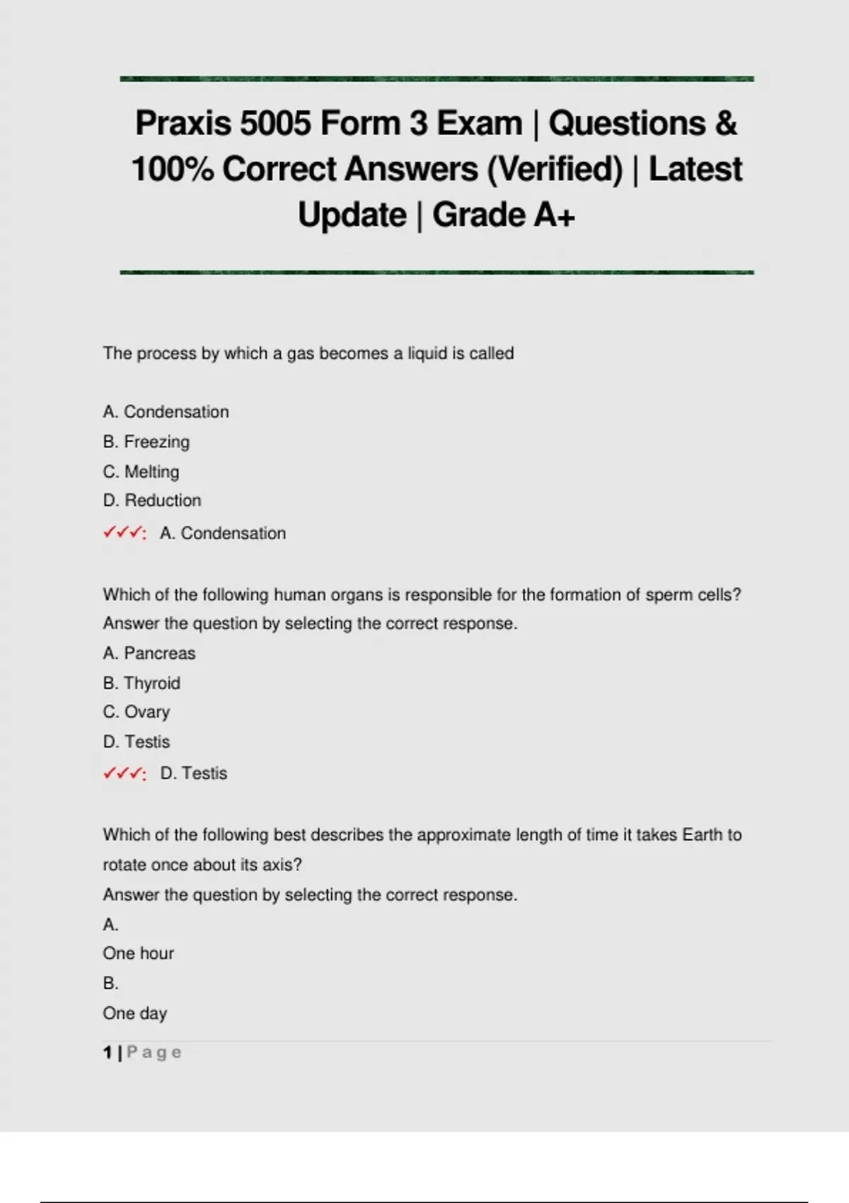 The process by which a gas becomes a liquid is called A. Condensation B. Freezing C. Melting D. Reduction : A. Condensation Which of the following human organs is responsible for the formation of sperm cells? Answer the question by selecting the correct response. A. Pancreas B. Thyroid C. Ovary D. Testis : D. Testis Which of the following best describes the approximate length of time it takes Earth to rotate once about its axis? Answer the question by selecting the correct response. A. One hour B. One day 2 | P a g e C. One month D. One year : B. One Day Which THREE of the following are generally acceptable rules for laboratory activities? Answer the question by selecting the correct responses. A. Students should wash their hands after mixing chemicals in the laboratory. B. Students should inform the teacher immediately of any accidents or spills in the laboratory. C. Students should use cracked glassware only when the teacher is in the laboratory. D. Students should read instructions thoroughly before performing laboratory procedures. : A. Students should wash their hands after mixing chemicals in the lab B. Students should inform the teacher immediately of any accidents or spills in the laboratory C. Students should read instructions thoroughly before performing lab procedures Which of the following processes most directly involves the movement of water from the atmosphere to Earth's surface? Answer the question by selecting the correct response. A. Infiltration B. Precipitation C. Transpiration 3 | P a g e D. Sublimation : B. Precipitation Which of the following is an important function of the digestive system? Answer the question by selecting the correct response. A. Absorbing nutrients into the body B. Transporting signals to and from different parts of the body C. Providing structural support for the body D. Protecting the body from ultraviolet radiation : A. Absorbing nutrients into the body As a rock begins tumbling down a hillside, most of its gravitational potential energy is converted into Answer the question by selecting the correct response. A. kinetic energ
