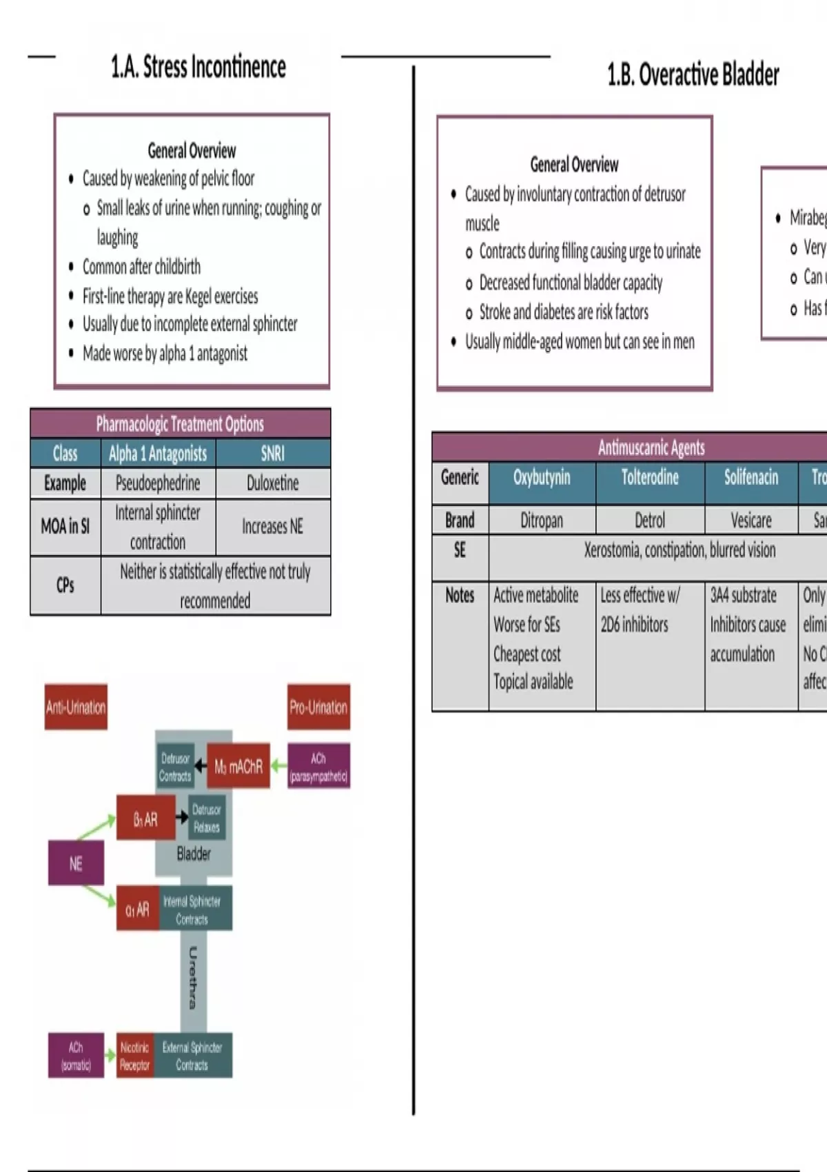 Review of pathophysiology, mechanism of action, side effects, and dosing for medications for management of female GU disorders.
