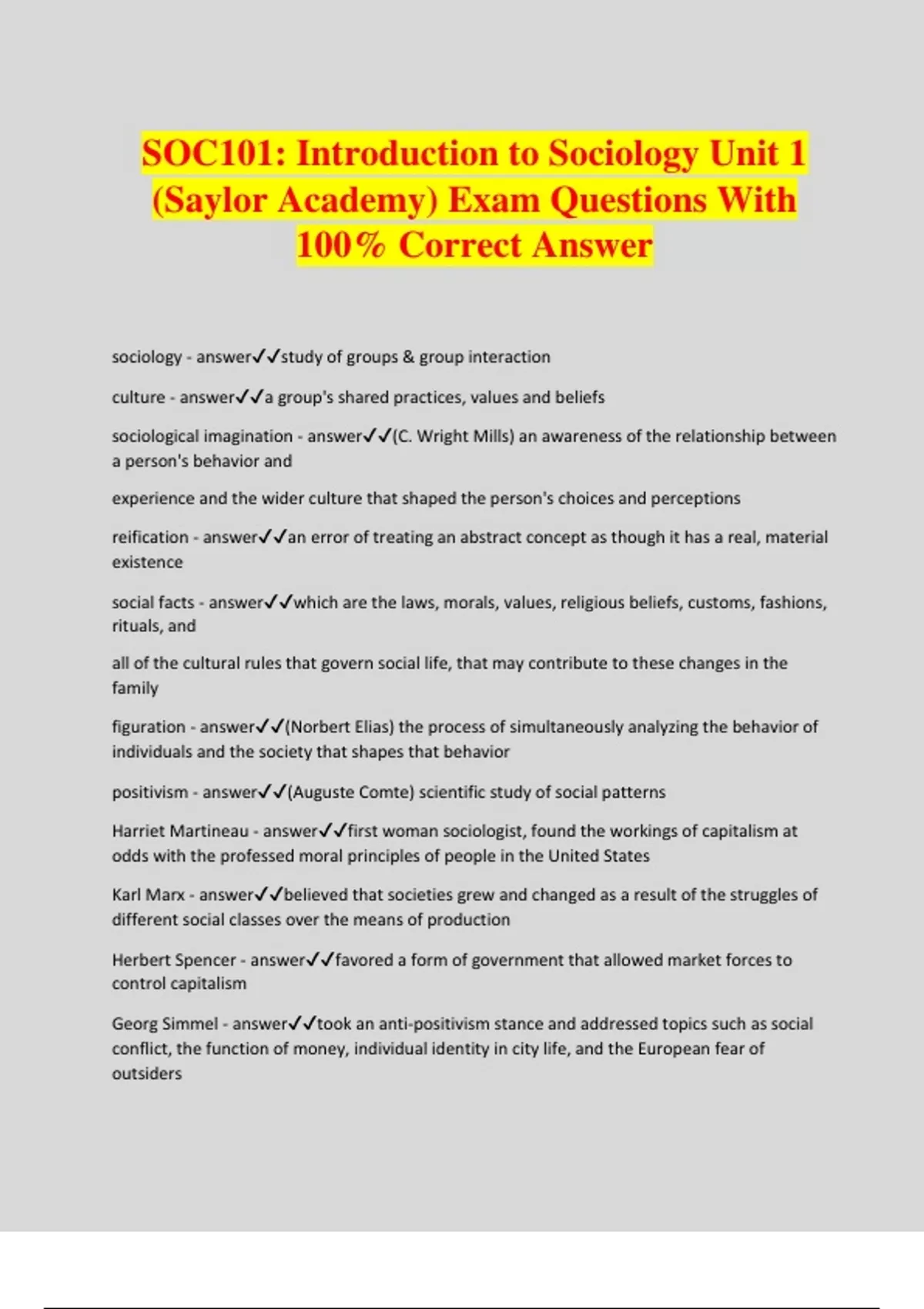 SOC101: Introduction to Sociology Unit 1 (Saylor Academy) Exam Questions With 100% Correct Answer sociology - answerstudy of groups & group interaction culture - answera group's shared practices, values and beliefs sociological imagination - answer(C. Wright Mills) an awareness of the relationship between a person's behavior and experience and the wider culture that shaped the person's choices and perceptions reification - answeran error of treating an abstract concept as though it has a real, material existence social facts - answerwhich are the laws, morals, values, religious beliefs, customs, fashions, rituals, and all of the cultural rules that govern social life, that may contribute to these changes in the family figuration - answer(Norbert Elias) the process of simultaneously analyzing the behavior of individuals and the society that shapes that behavior positivism - answer(Auguste Comte) scientific study of social patterns Harriet Martineau - answerfirst woman sociologist, found the workings of capitalism at odds with the professed moral principles of people in the United States Karl Marx - answerbelieved that societies grew and changed as a result of the struggles of different social classes over the means of production Herbert Spencer - answerfavored a form of government that allowed market forces to control capitalism Georg Simmel - answertook an anti-positivism stance and addressed topics such as social conflict, the function of money, individual identity in city life, and the European fear of outsiders