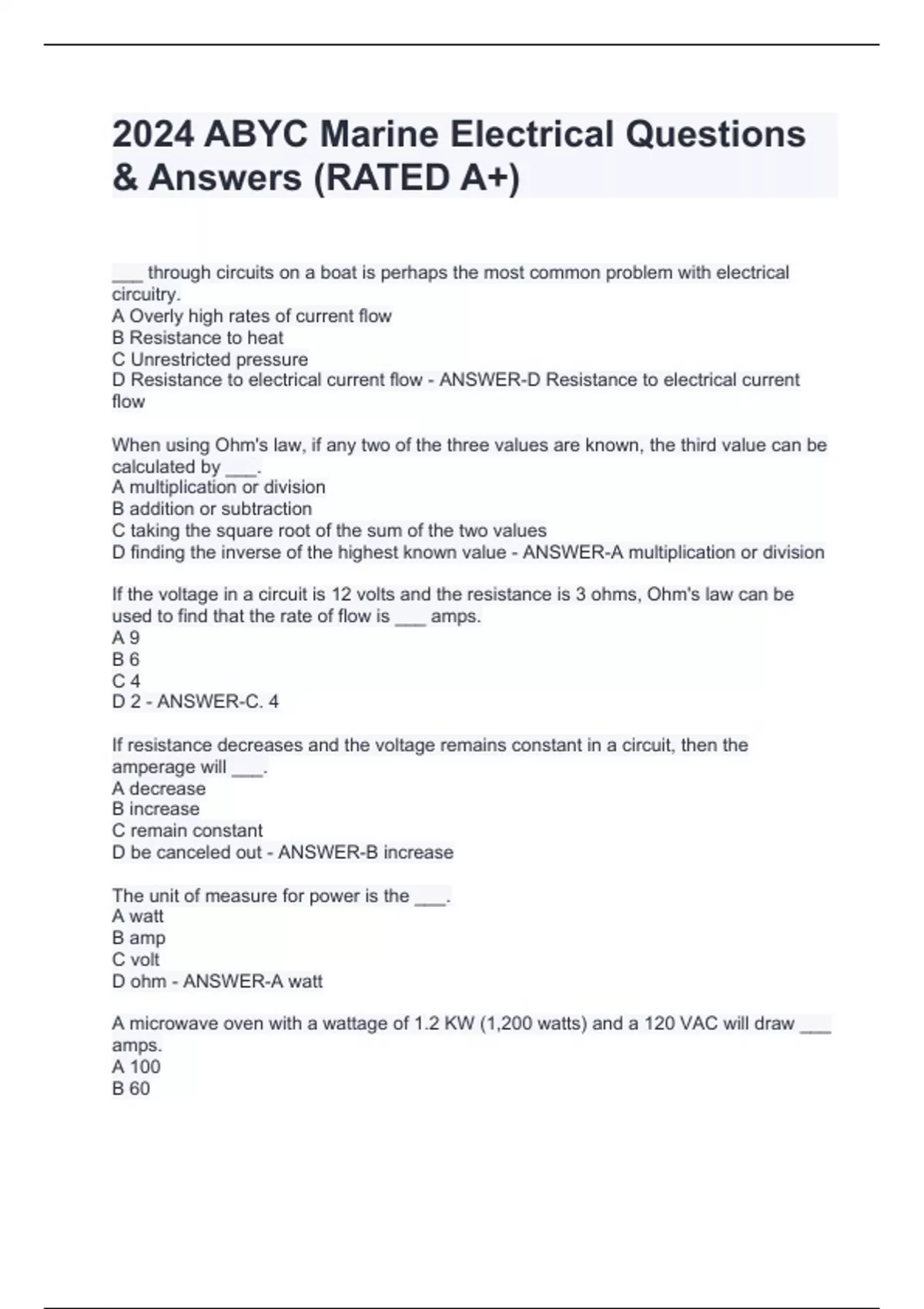 2024 ABYC Marine Electrical Questions & Answer___ through circuits on a boat is perhaps the most common problem with electrical circuitry. A Overly high rates of current flow B Resistance to heat C Unrestricted pressure D Resistance to electrical current flow - ANSWER-D Resistance to electrical current flow When using Ohm's law, if any two of the three values are known, the third value can be calculated by ___. A multiplication or division B addition or subtraction C taking the square root of the sum of the two values D finding the inverse of the highest known value - ANSWER-A multiplication or division If the voltage in a circuit is 12 volts and the resistance is 3 ohms, Ohm's law can be used to find that the rate of flow is ___ amps. A 9 B 6 C 4 D 2 - ANSWER-C. 4 If resistance decreases and the voltage remains constant in a circuit, then the amperage will ___. A decrease B increase C remain constant D be canceled out - ANSWER-B increase The unit of measure for power is the ___. A watt B amp C volt D ohm - ANSWER-A watt A microwave oven with a wattage of 1.2 KW (1,200 watts) and a 120 VAC will draw ___ amps. A 100 B 60 C 20 s (RATED A+)