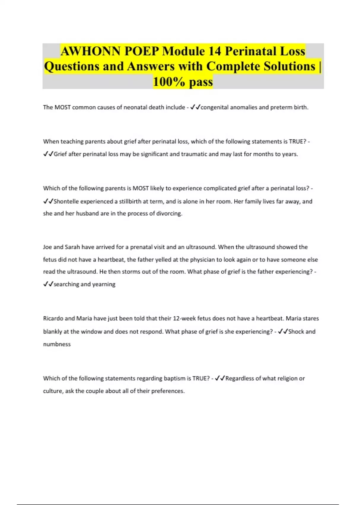AWHONN POEP Module 14 Perinatal Loss Questions and Answers with Complete Solutions | 100% pass