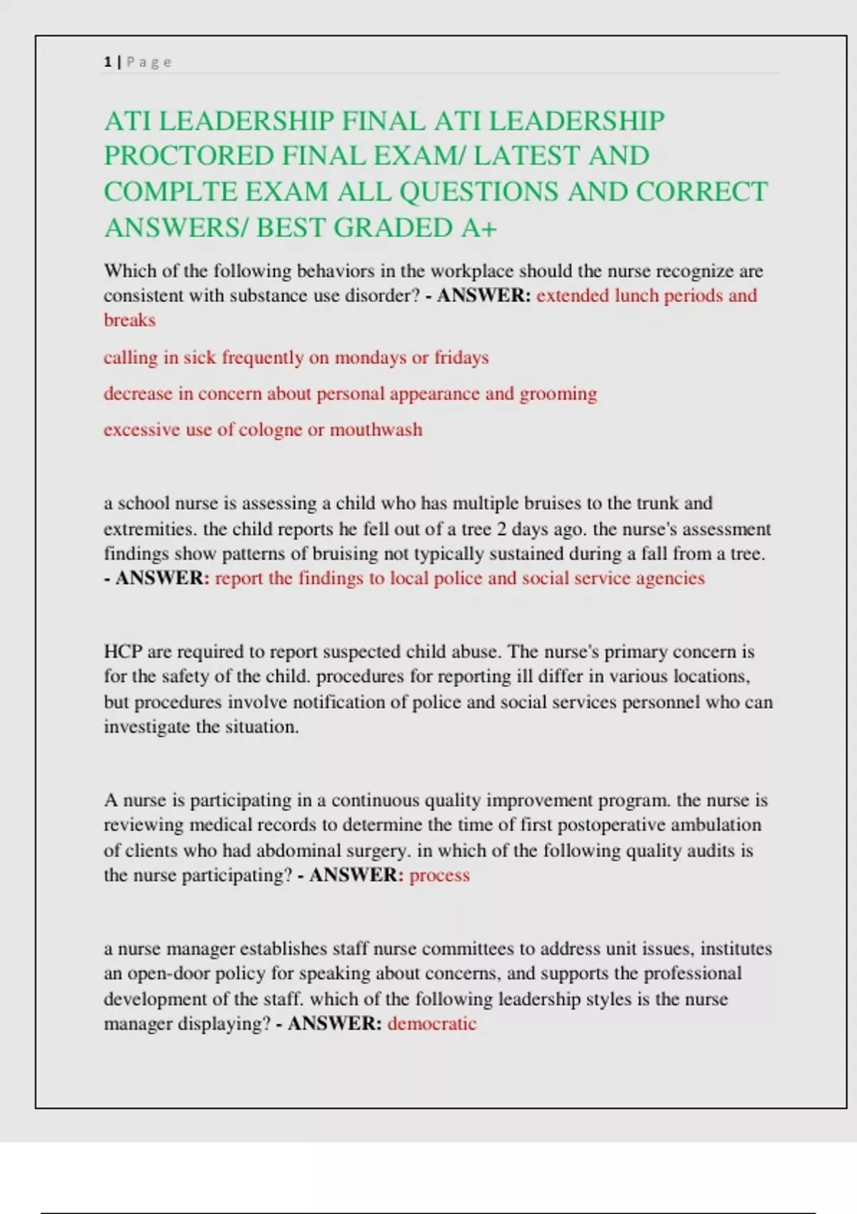 ATI LEADERSHIP FINAL ATI LEADERSHIP PROCTORED FINAL EXAM/ LATEST AND COMPLTE EXAM ALL QUESTIONS AND CORRECT ANSWERS/ BEST GRADED A+